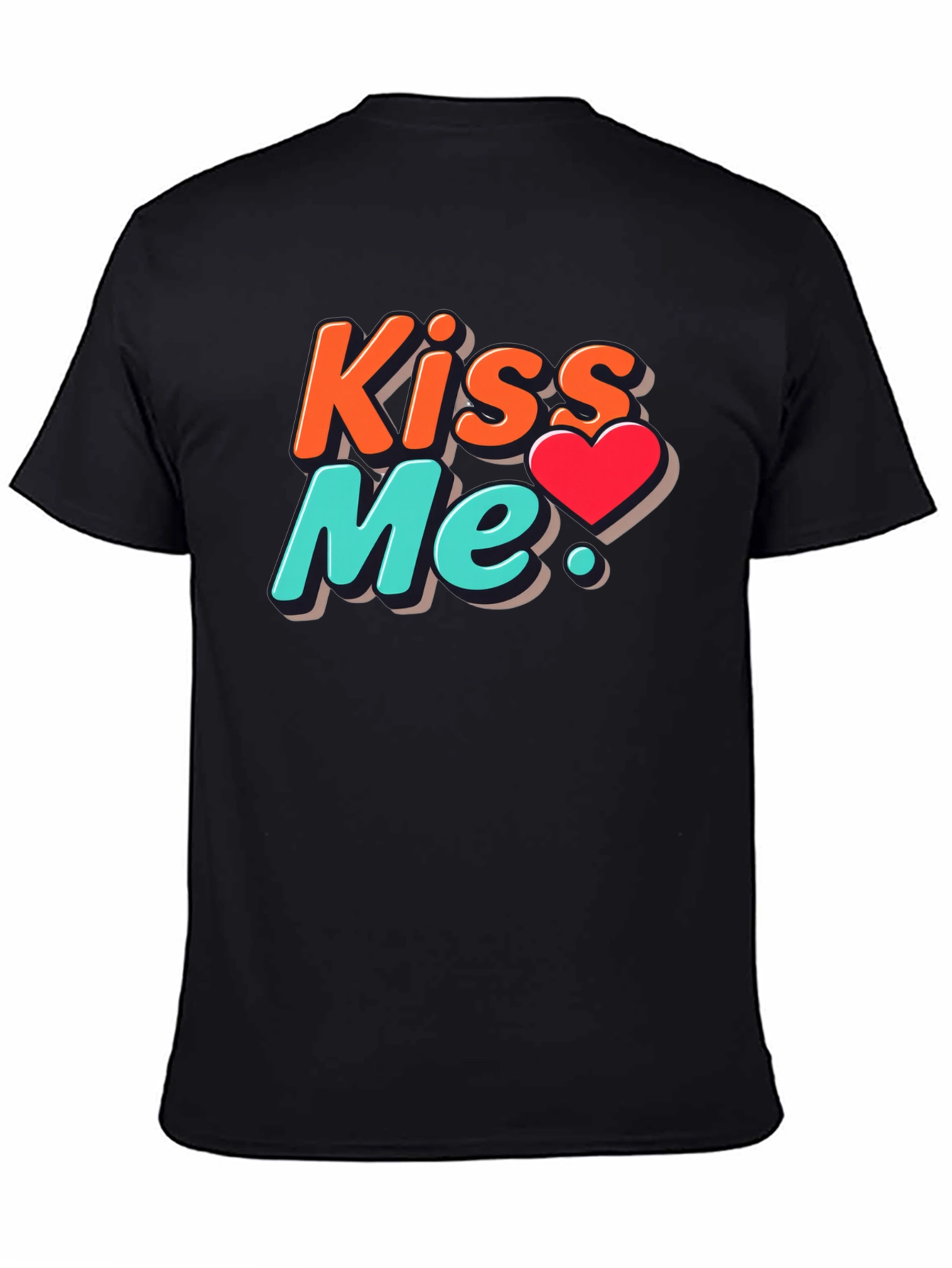 Show your affection with this eye-catching Kiss Me graphic t-shirt. This stylish black tee features a bold, colorful design with "Kiss" in vibrant orange and "Me" in teal, punctuated by a charming red heart. Made from a soft, comfortable fabric, this shirt is perfect for casual wear or a fun Valentine's Day outfit. Its classic fit makes it suitable for anyone who wants to spread a little love. Stand out from the crowd and let this shirt do the talking! Great for parties, dates, or simply expressing yourself. Get yours today and wear your heart on your sleeve!