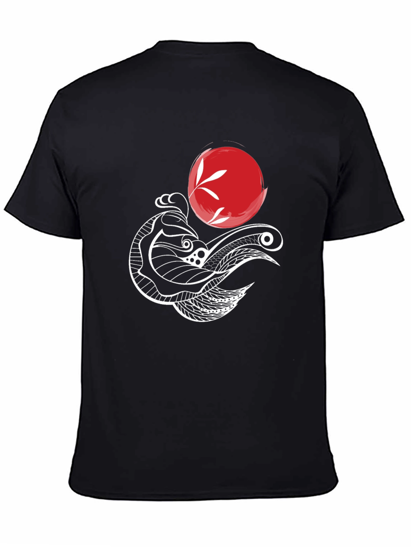 Elevate your casual style with this unique black graphic tee. Featuring a captivating white koi fish design with a bold red sun accent, this shirt is a statement piece. The intricate details of the fish, combined with the modern silhouette, create an eye-catching look. Made from a soft, comfortable fabric, this tee is perfect for everyday wear. Pair it with jeans for a relaxed weekend vibe or dress it up with chinos for a more refined look. Show off your artistic flair with this stylish and comfortable tee!