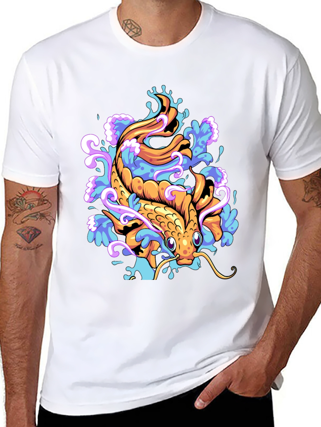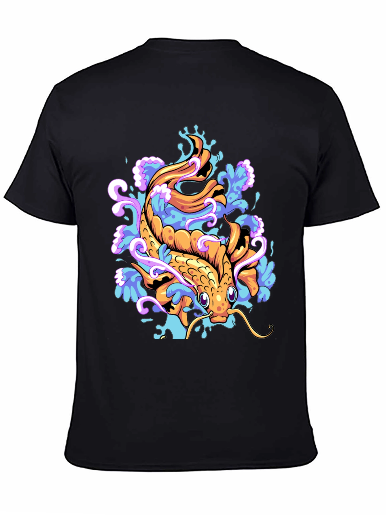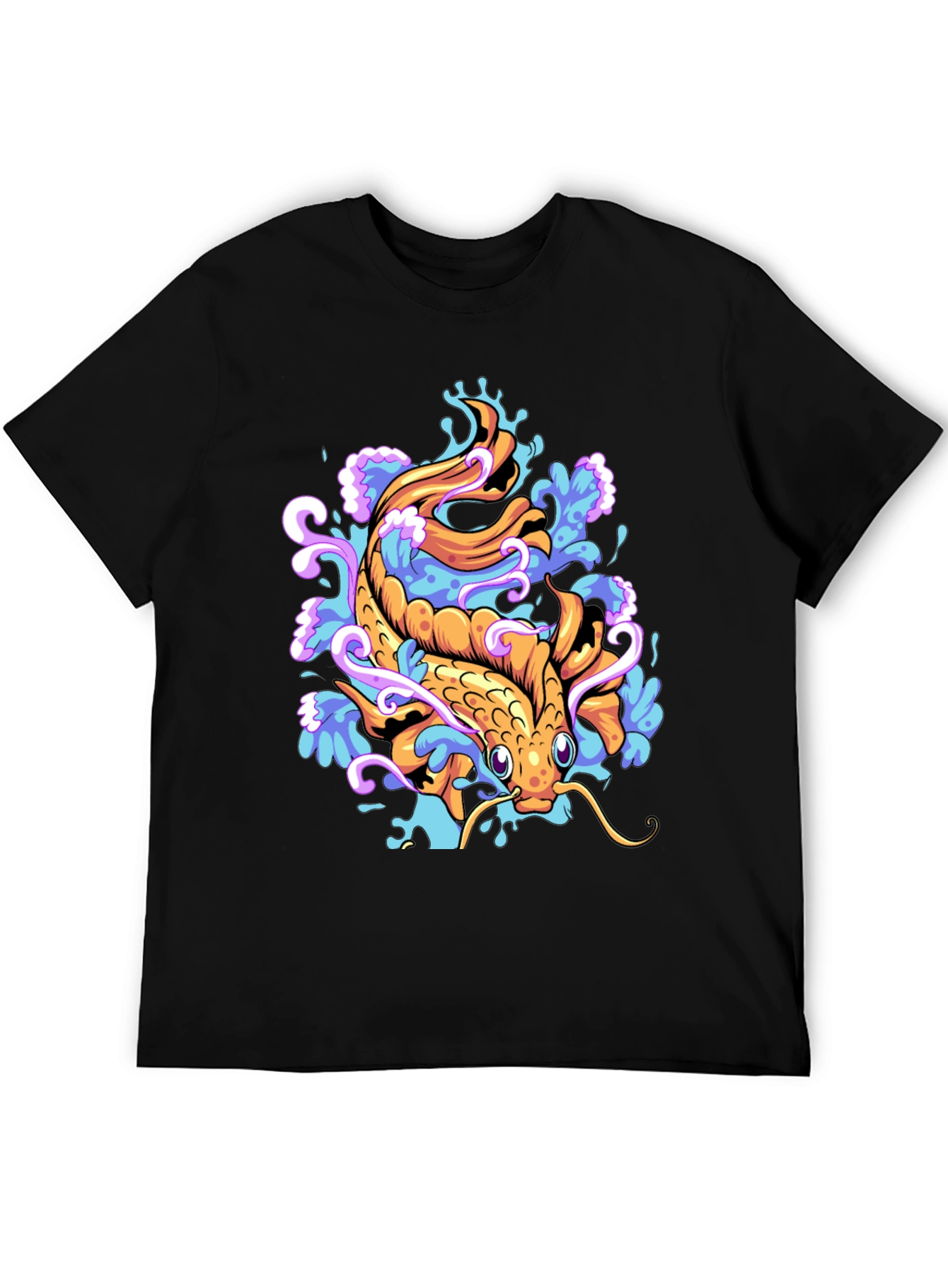Dive into style with this striking black t-shirt featuring a vibrant koi fish design. The graphic showcases a detailed, golden koi swimming amidst blue and white stylized water, creating a dynamic and eye-catching visual. Made from what appears to be a soft cotton blend, this tee promises comfort and breathability. Perfect for casual wear, expressing your unique personality, or as a standout piece in your wardrobe. Pair it with jeans, shorts, or layer it under a jacket for a cool, effortless look. Make a splash with this unique tee!