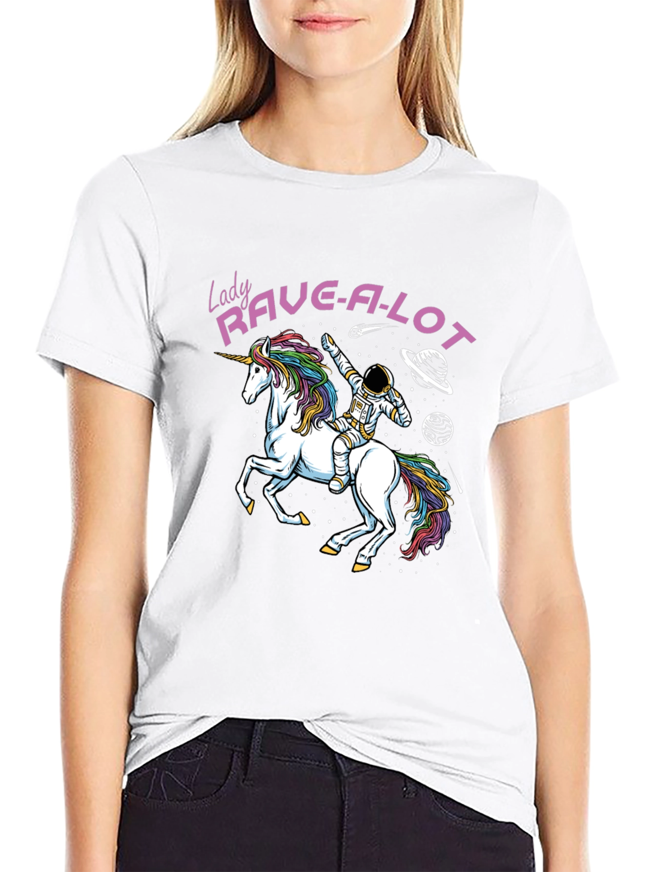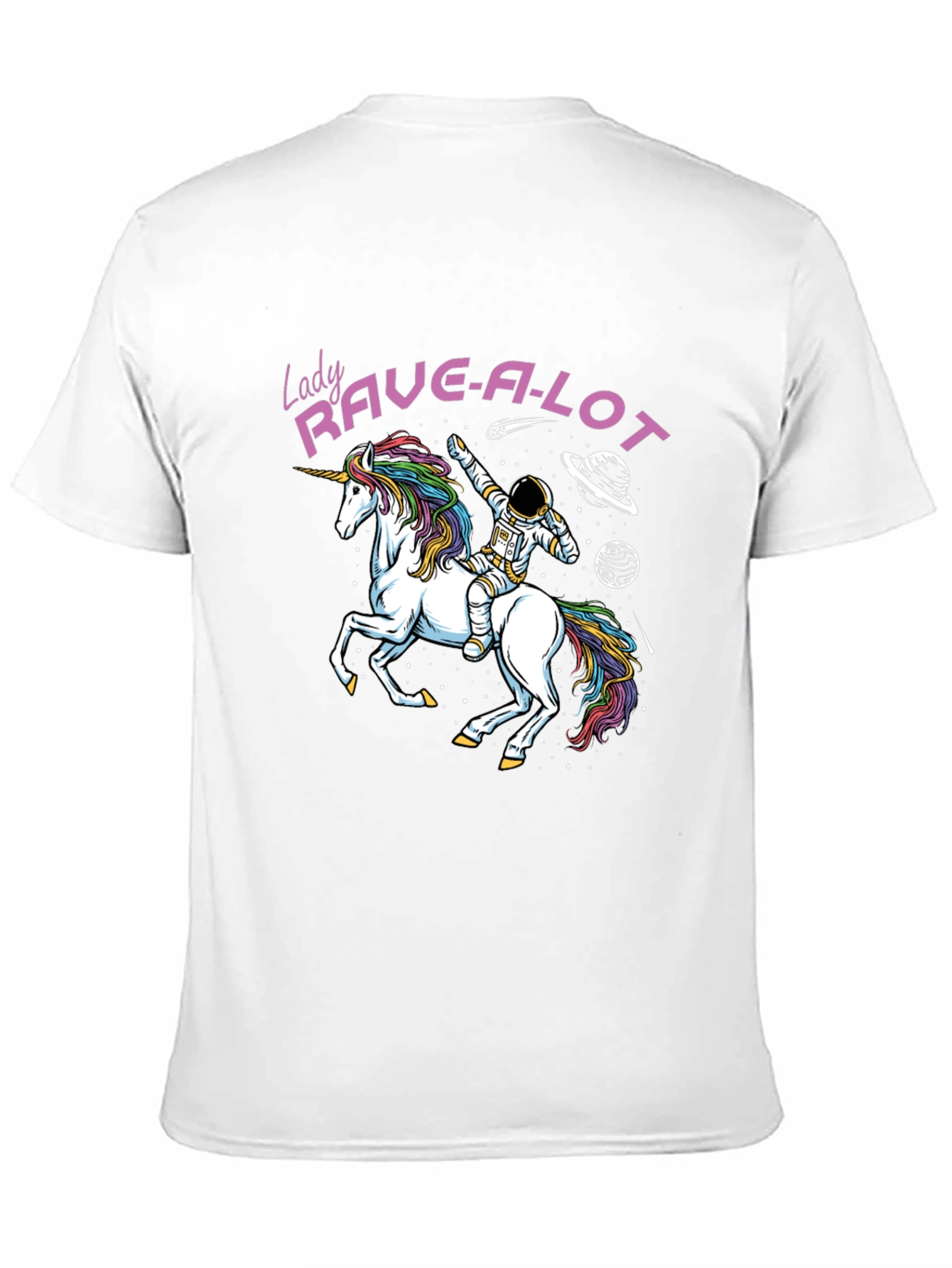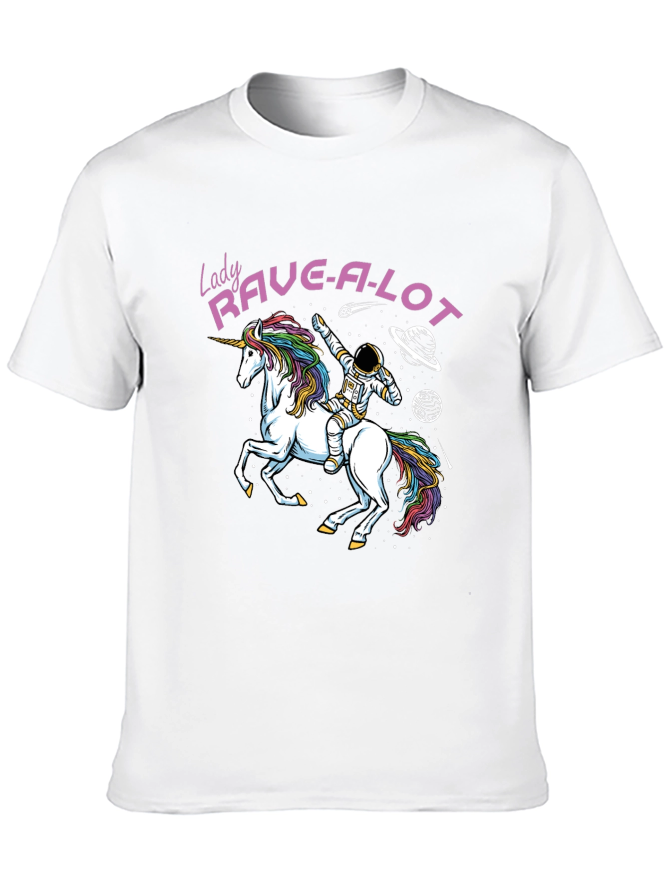 Show off your love for rave culture and fantasy with this unique graphic tee! Featuring a vibrant design of an astronaut riding a rainbow-maned unicorn through space, surrounded by planets and stars, this shirt is sure to turn heads. The bold "Lady Rave-A-Lot" text adds a playful touch. Made from a comfortable material, this tee is perfect for casual wear, concerts, or themed parties. Its eye-catching design makes it a great conversation starter and a fun addition to any wardrobe. Express your individuality and let your inner rave spirit shine!