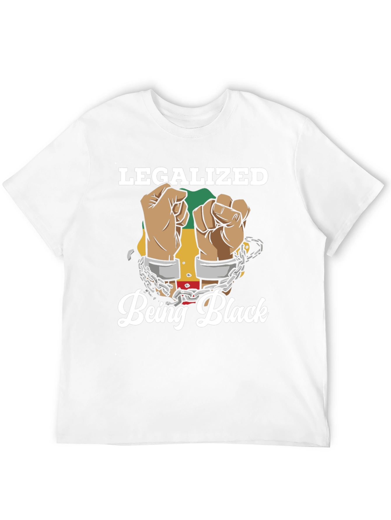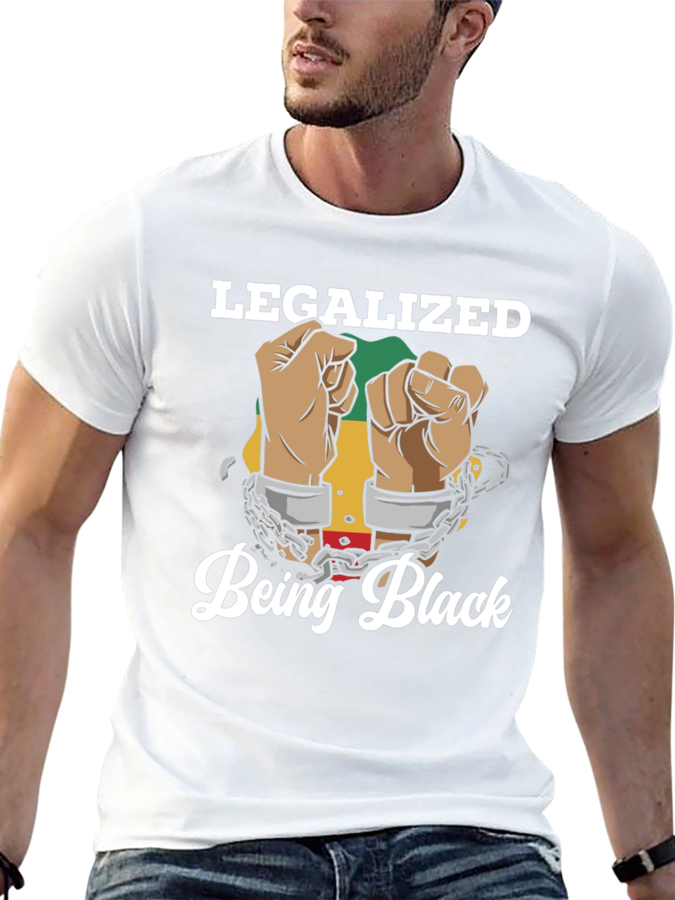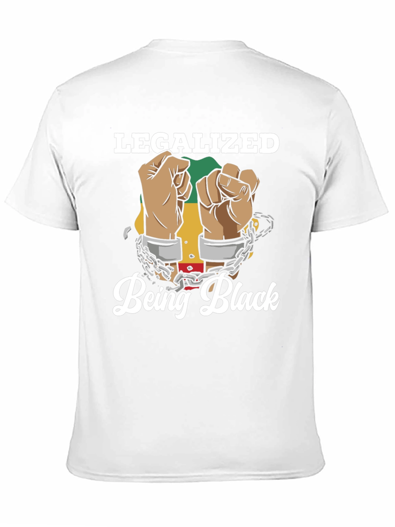 Embrace a powerful message with this striking black graphic t-shirt. The design features the phrase 'Legalized Being Black' boldly printed in white, above and below an image of clenched fists breaking free from chains. The fists are set against a background of Pan-African colors (red, yellow, green), symbolizing unity, freedom, and empowerment. Made from comfortable, breathable fabric, this tee is perfect for making a statement while staying comfortable. Wear it to rallies, social gatherings, or as a daily reminder of strength and resilience. Show your support for equality and justice with this impactful piece.
