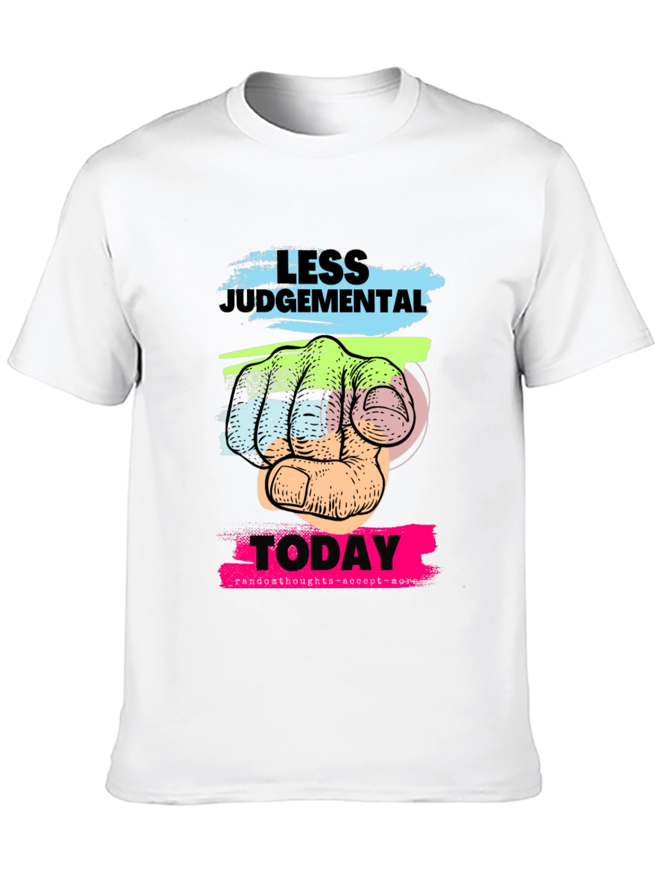 This eye-catching black t-shirt features a unique graphic design with the text "LESS JUDGEMENTAL TODAY." The design incorporates colorful, textured brushstrokes in blue, green, and pink. At the center is an illustrated hand pointing directly forward, adding a bold and distinctive element. Made from a soft-looking fabric, this t-shirt appears comfortable and suitable for everyday wear. Its casual style makes it perfect for expressing a positive message, promoting inclusivity, and sparking conversation. Wear it with jeans, shorts, or a casual skirt for a relaxed yet impactful look. This tee would be ideal for social gatherings, casual outings, or simply lounging at home while making a statement.