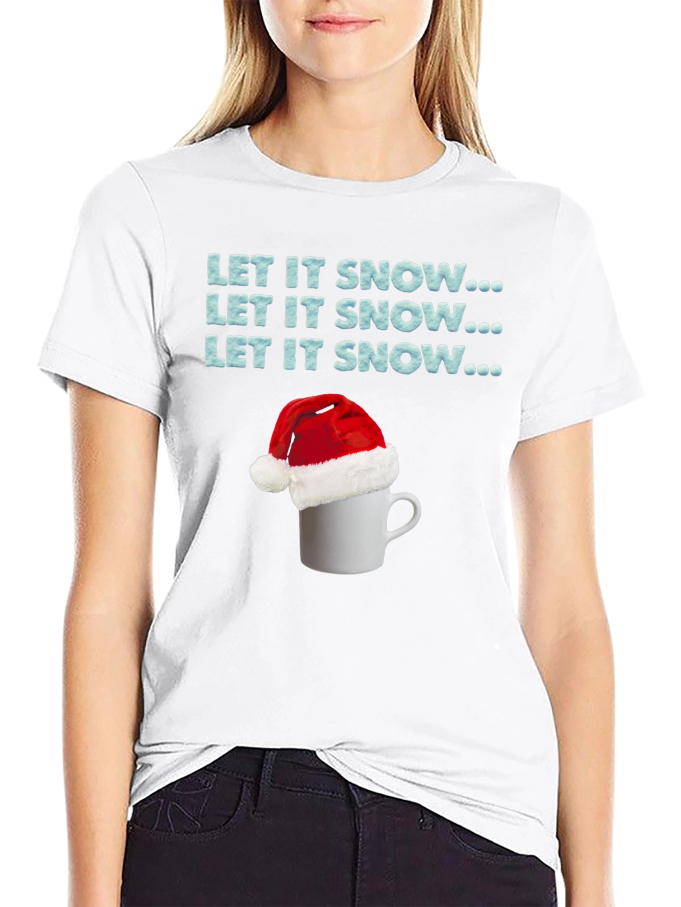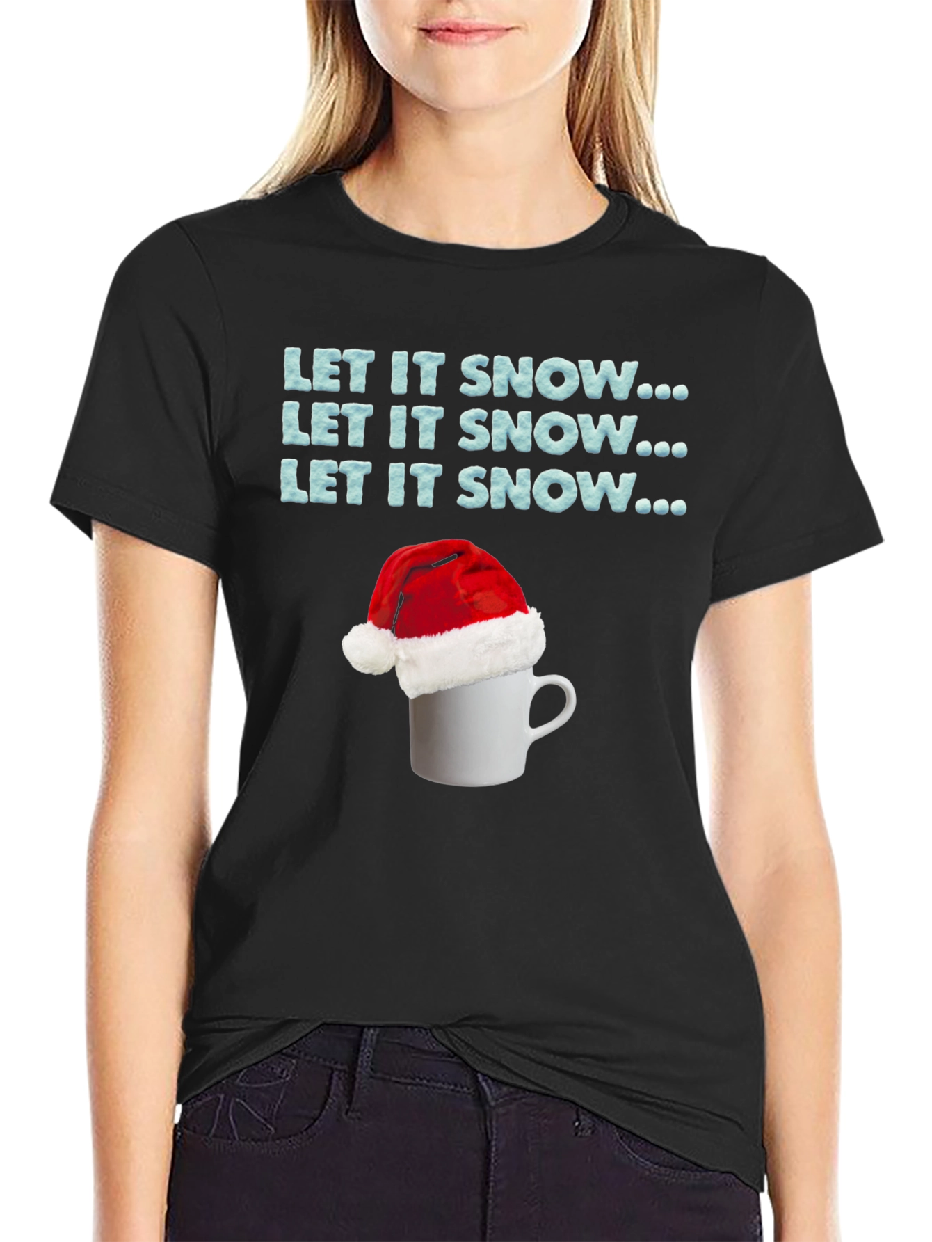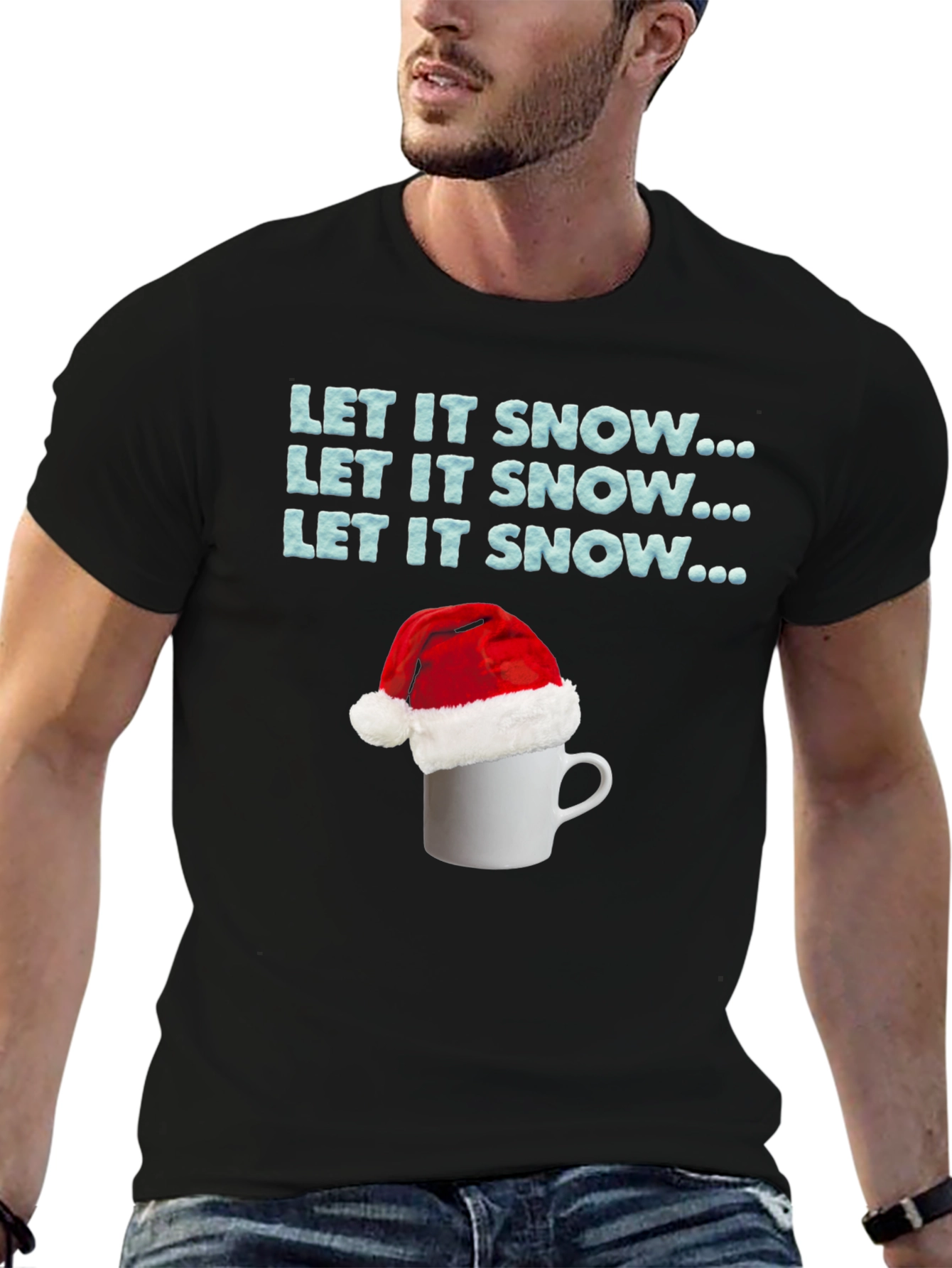 Get into the holiday spirit with this playful black t-shirt featuring a festive design! The shirt showcases the phrase "LET IT SNOW..." repeated three times in an icy blue font, creating a wintery vibe. Below, a white mug topped with a classic red and white Santa hat adds a touch of whimsy and warmth. Made from a comfortable-looking material, this t-shirt is perfect for casual holiday gatherings, winter outings, or simply spreading cheer wherever you go. Show off your love for the holiday season with this fun and unique apparel!