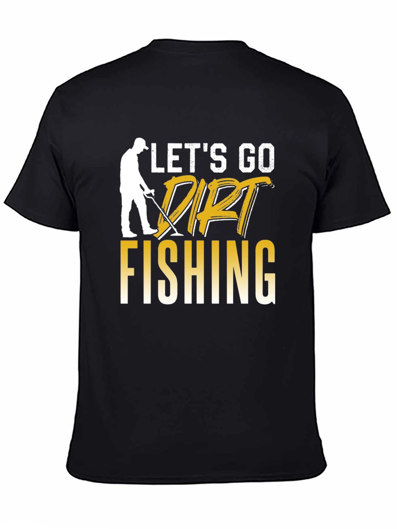 Show off your unique hobby with this "Let's Go Dirt Fishing" graphic tee. Featuring a striking design with a silhouette of a person using a metal detector, overlaid with stylized text. The bold, contrasting colors make the design pop against the dark, soft cotton. Comfortable and stylish, this short-sleeve shirt is perfect for casual wear or as a gift for the treasure hunter in your life. Whether you're actually out searching for buried relics or just relaxing with friends, this shirt is sure to spark conversation and showcase your passion for the hobby.