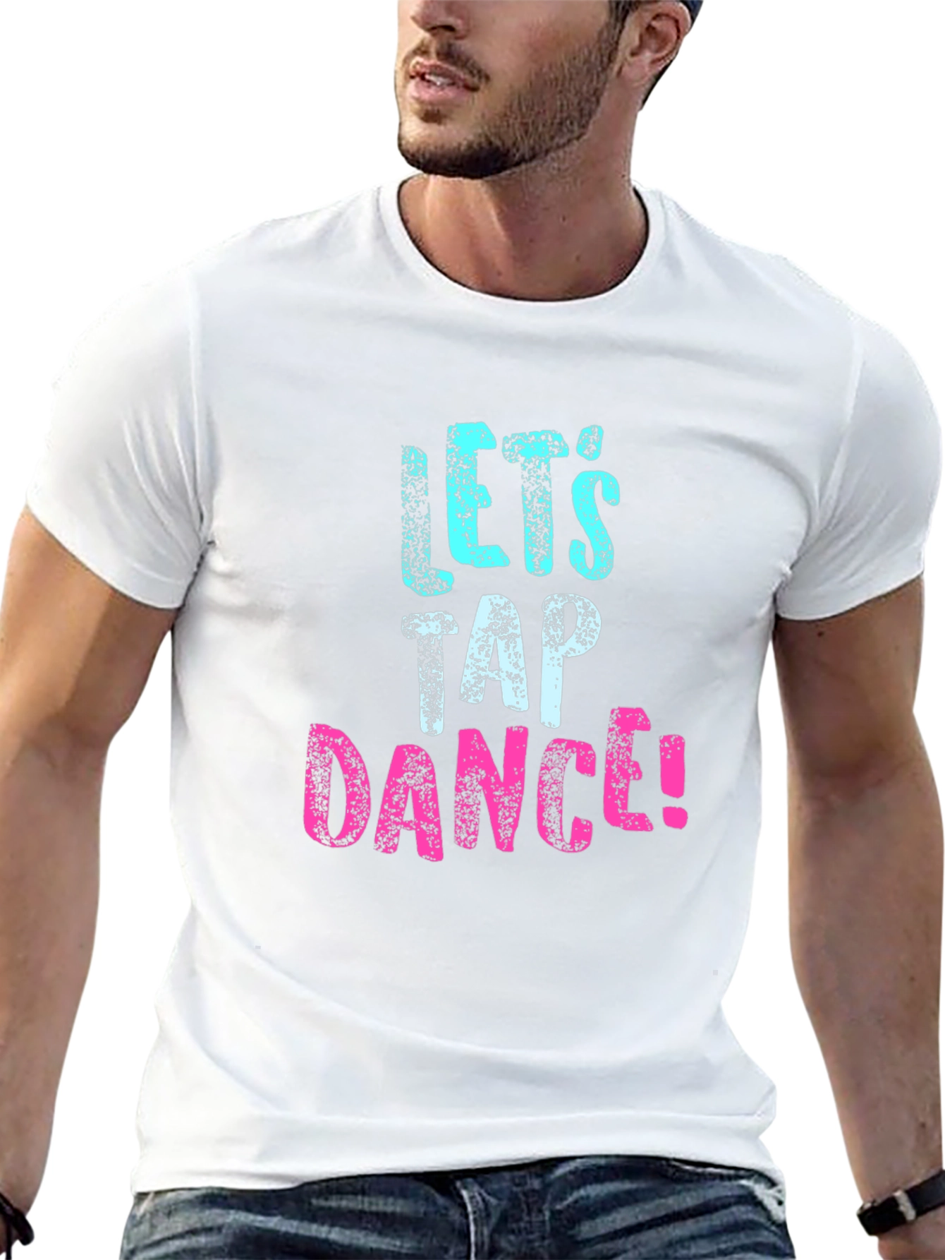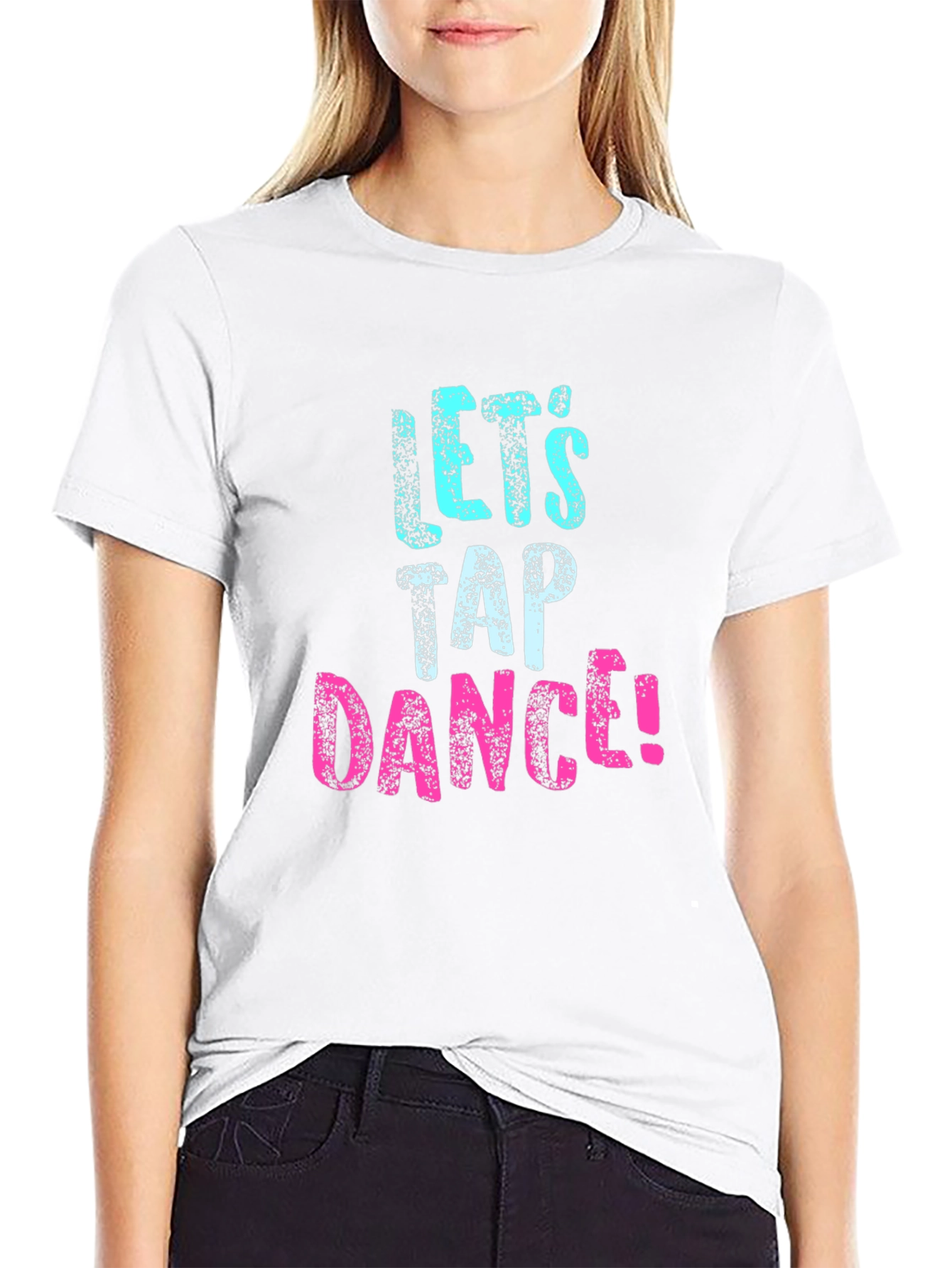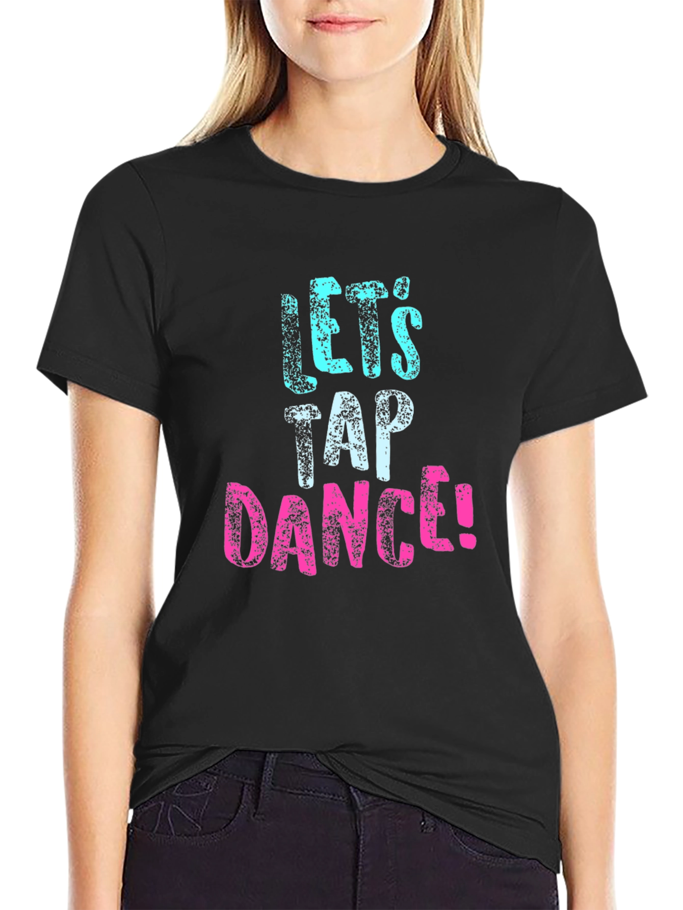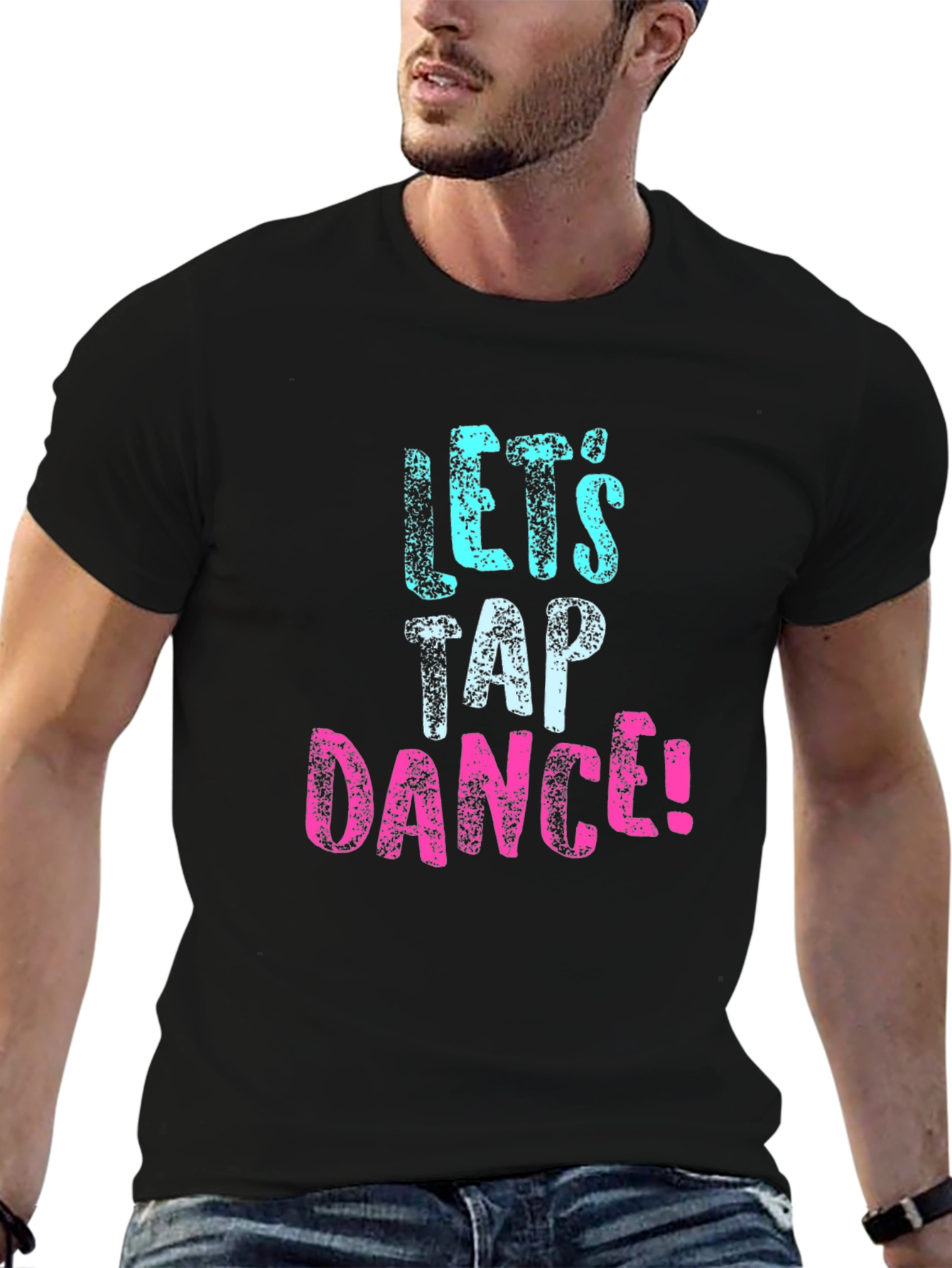 Show your love for tap dancing with this stylish black T-shirt! The tee features a bold graphic print that reads "Let's Tap Dance!" in a fun, textured font. The word 'Let's' is in a vibrant aqua blue, while 'Dance!' pops in a bright pink, making a playful statement. Made from what appears to be soft, breathable cotton, this shirt offers both comfort and durability. The classic crew neck and short sleeves make it a versatile piece for casual wear, dance practice, or even as a fun performance outfit. Perfect for tap dancers of all levels, this T-shirt is a must-have addition to your wardrobe. Grab yours now and get ready to tap your way into style!