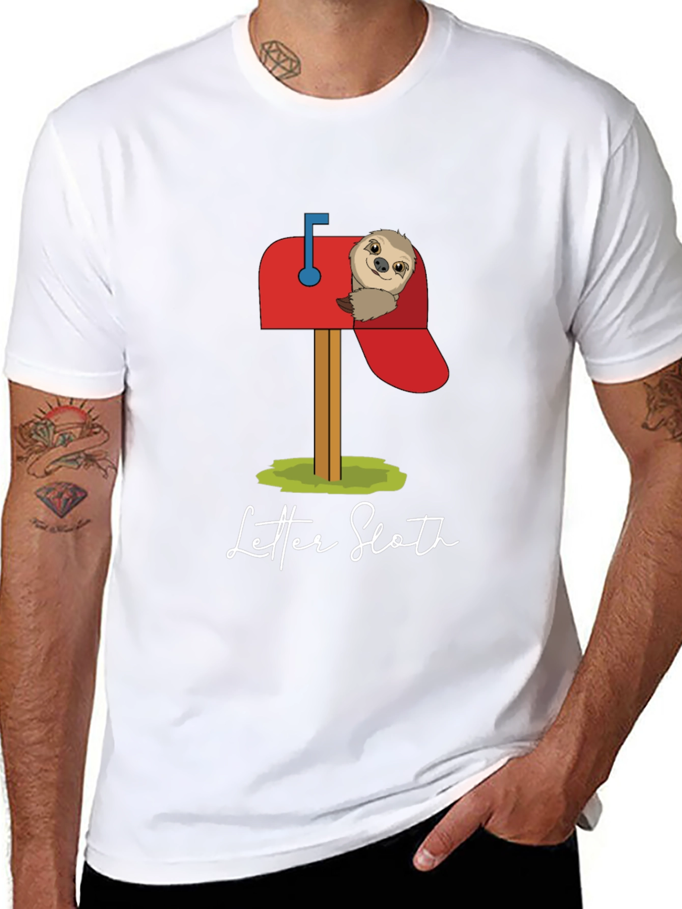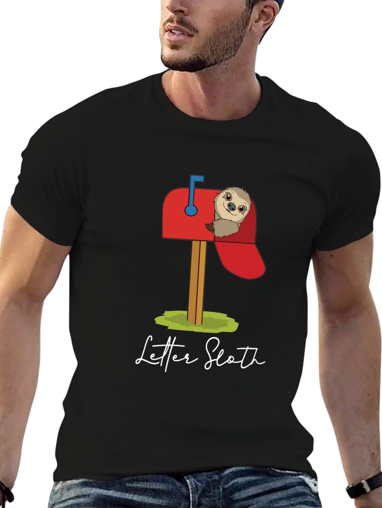 This black graphic T-shirt features an adorable design of a sloth peeking out of a red mailbox. The playful "Letter Sloth" design is perfect for animal lovers. Made from what appears to be a soft, breathable cotton blend, this tee offers both comfort and style. The classic crew neck and short sleeves make it a versatile addition to any wardrobe. Wear it casually with jeans, shorts, or dress it up with a blazer. It’s ideal for everyday wear, casual outings, or as a fun gift for sloth enthusiasts. Get yours today!