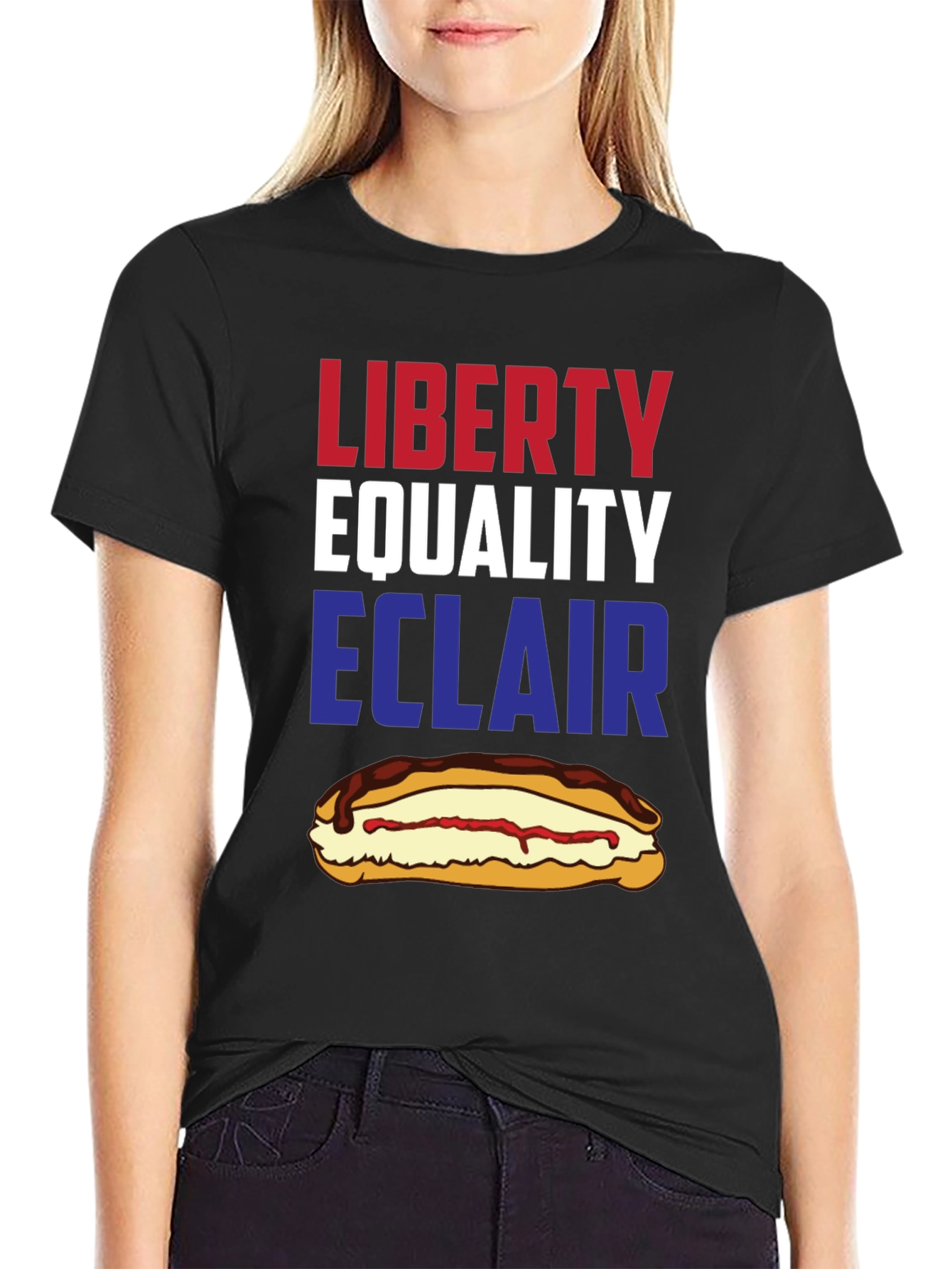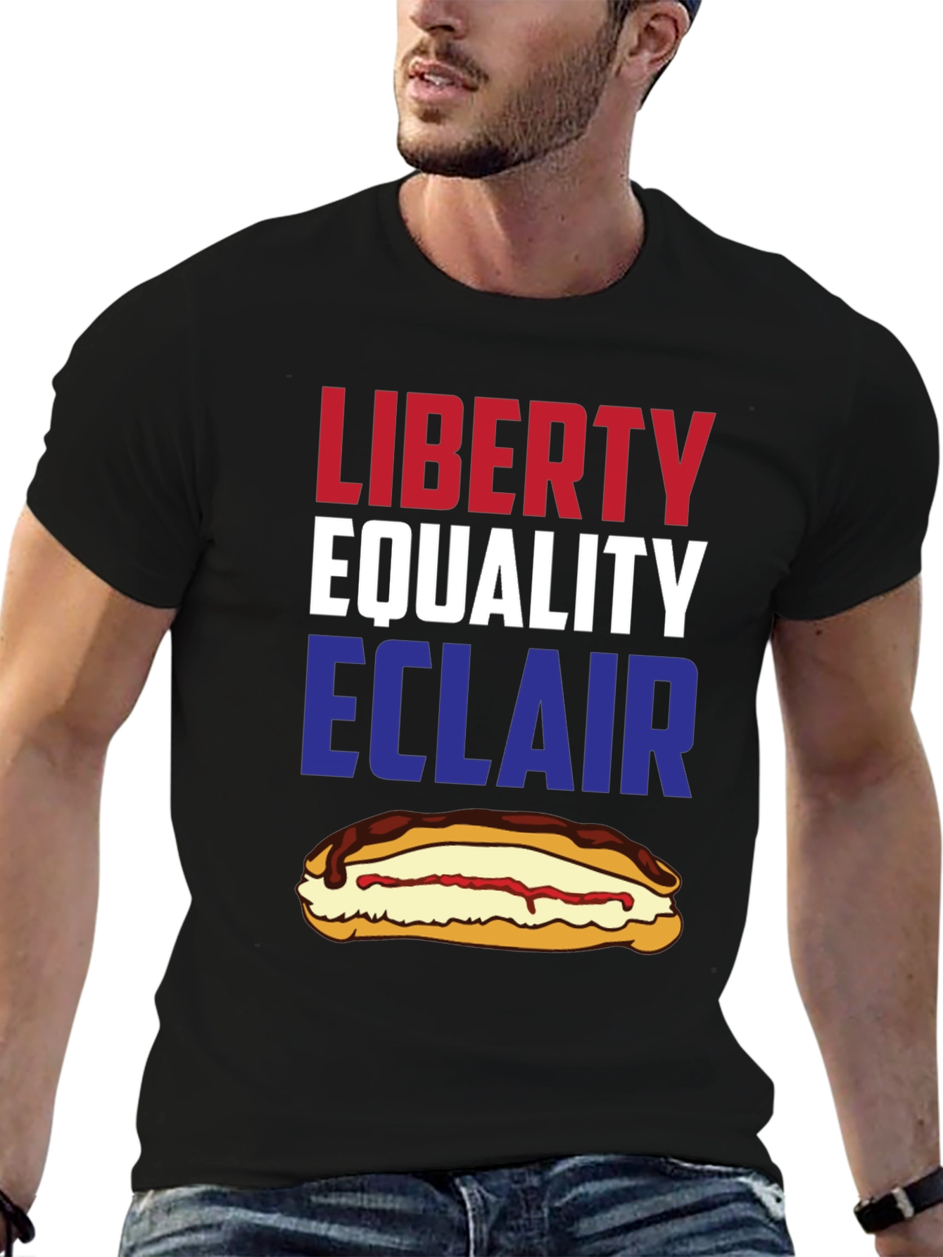 Show off your love for delicious French pastries and a great sense of humor with this unique t-shirt! The shirt features the words 'Liberty' in red, 'Equality' in white, and 'Eclair' in blue, stacked above a detailed graphic of a mouthwatering eclair. Made from soft, breathable fabric, this tee is perfect for everyday wear, casual outings, or as a fun conversation starter. Ideal for anyone with a sweet tooth, a love for France, or a quirky sense of style. Get yours today and wear your passions!
