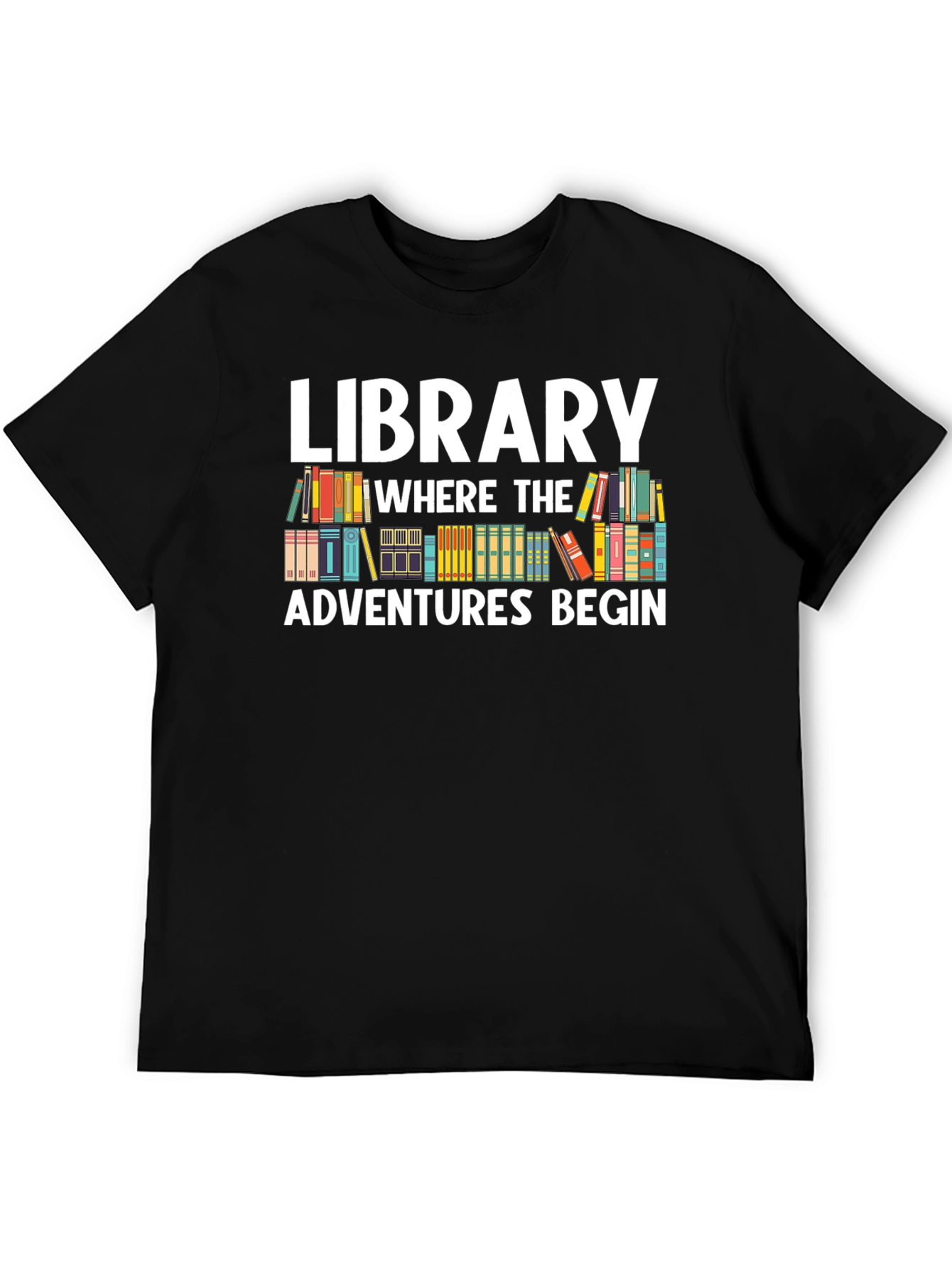 Show your love for books and libraries with this stylish graphic tee! The shirt features the phrase "LIBRARY WHERE THE ADVENTURES BEGIN" in bold white letters, displayed above a colorful stack of illustrated books. The design captures the magic of reading and the endless possibilities found within the pages of a good book. Made from soft, breathable fabric, this t-shirt offers all-day comfort. It's perfect for casual wear, library visits, book clubs, or as a gift for the bookworm in your life. Let everyone know that you're a reader and appreciate the importance of libraries in our world with this unique and eye-catching tee!