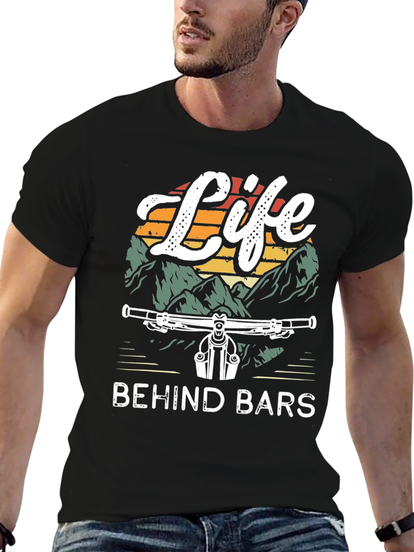 Embrace your love for mountain biking with this stylish black graphic tee! The shirt features a unique design incorporating a retro-style sunset over mountain peaks, with a bicycle handlebar illustration and the phrase 'Life Behind Bars'. Made from a comfortable-looking fabric, this tee is perfect for casual wear or as a statement piece during your outdoor adventures. Show off your passion for cycling with this eye-catching and comfortable t-shirt. Ideal for cyclists, outdoor enthusiasts, or anyone who appreciates unique graphic designs. Get yours today!