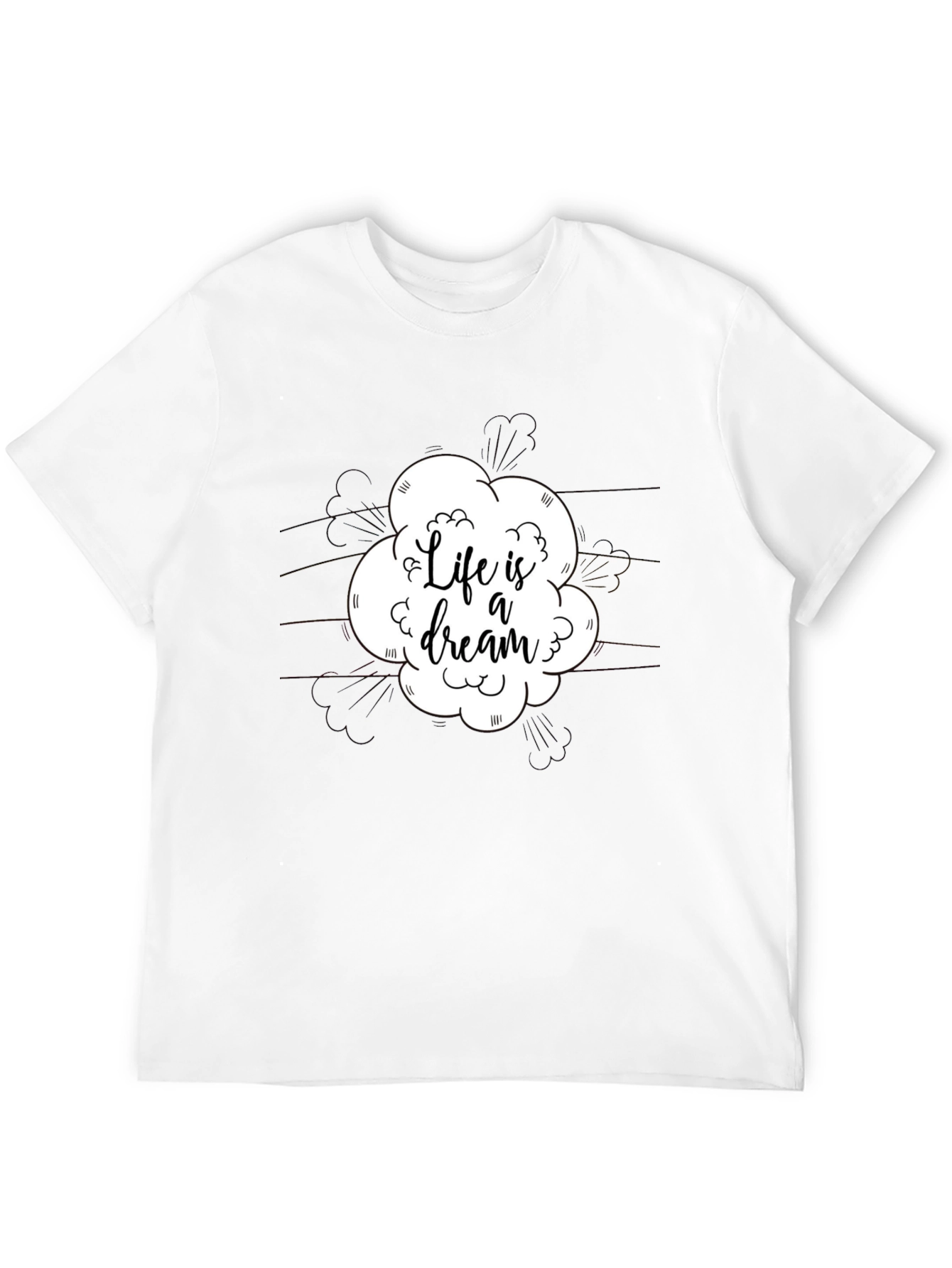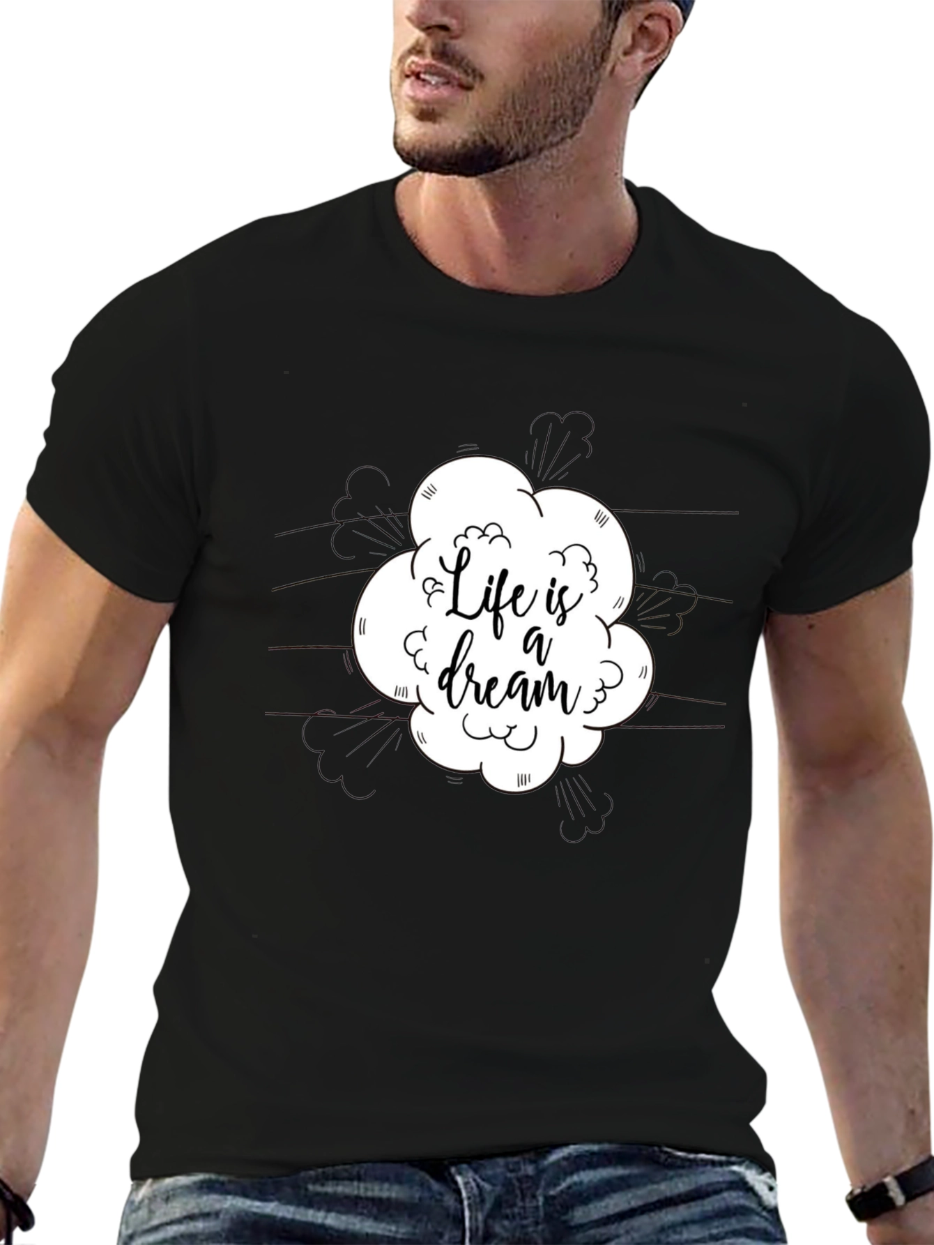Embrace a relaxed vibe with this classic black t-shirt featuring a unique "Life is a Dream" graphic. The design is printed in white on a cloud-like shape at the center of the shirt. The tee appears to be crafted from a soft, breathable fabric that would provide all-day comfort. The simple yet stylish design makes it versatile for everyday wear, casual outings, or lounging at home. Pair with your favorite jeans, shorts, or joggers for an effortlessly cool look. This tee is a simple reminder to cherish the moments and chase your dreams.