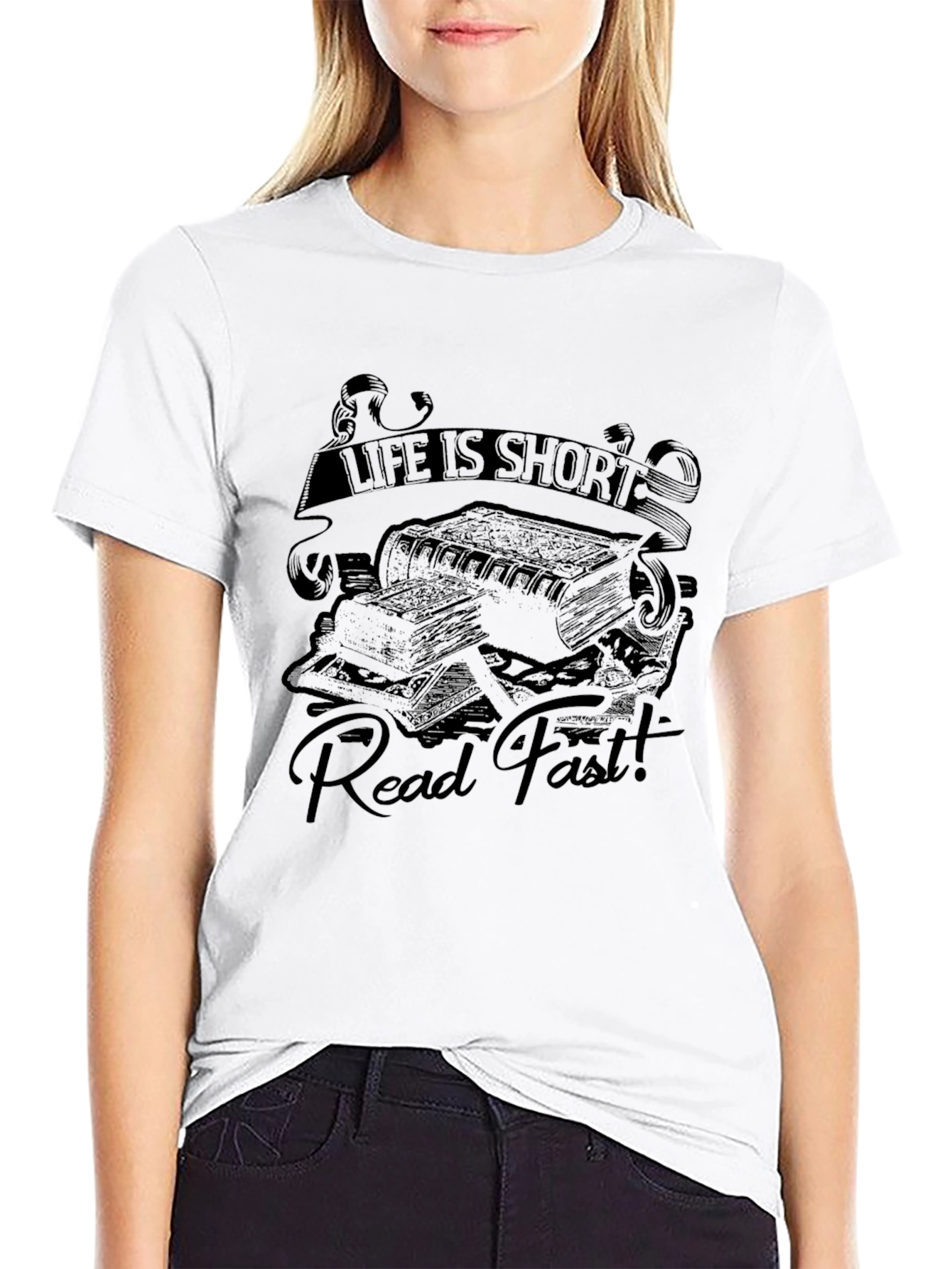 This stylish black t-shirt features a unique graphic design centered around the phrase "Life is Short Read Fast." The print includes stylized text and detailed illustration of books, creating a visually appealing and intellectual aesthetic. The shirt is made from what appears to be a soft, comfortable cotton blend, making it ideal for casual wear. Perfect for book lovers and avid readers, this tee is a great way to express your passion for literature. Wear it to the library, bookstore, coffee shop, or simply while relaxing at home with a good book. The classic fit and versatile design make it easy to pair with jeans, shorts, or your favorite casual bottoms. Add a touch of literary flair to your wardrobe with this eye-catching graphic tee!