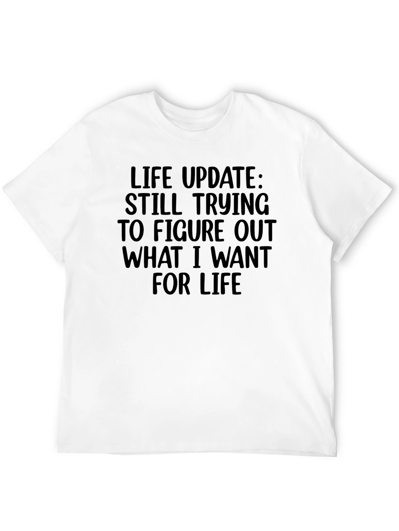 Express your current life stage with this comfortable and stylish black t-shirt. The bold graphic print reads "LIFE UPDATE: STILL TRYING TO FIGURE OUT WHAT I WANT FOR LIFE", making it a relatable and humorous statement piece. Crafted from what appears to be soft, breathable cotton, this tee offers all-day comfort and effortless style. Ideal for casual outings, lounging at home, or making a statement wherever you go, this t-shirt is a versatile addition to any wardrobe. The classic black color ensures easy pairing with jeans, shorts, or joggers. Let this tee be a conversation starter and a reflection of your journey!