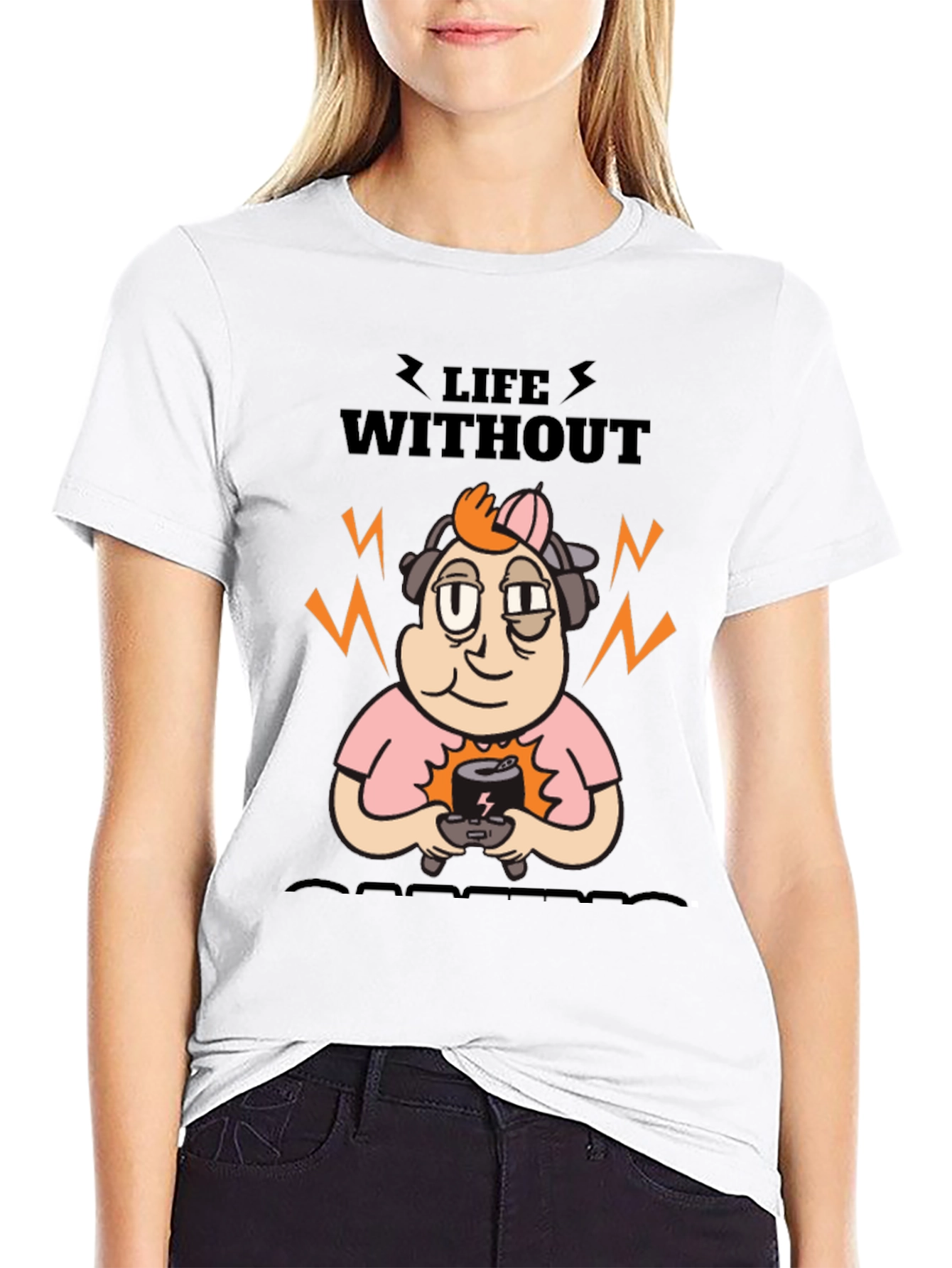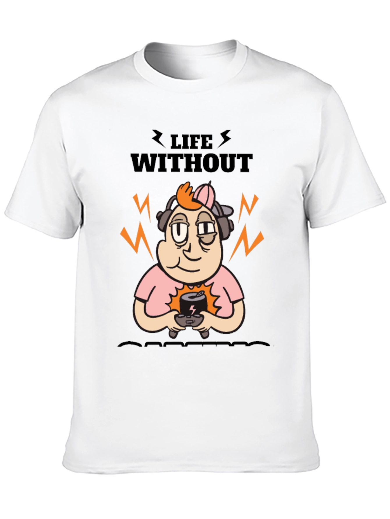Show off your love for gaming with this unique black t-shirt. Featuring a cartoon graphic of a gamer engrossed in play, complete with vibrant lightning bolt accents, this tee is perfect for expressing your passion. The shirt displays "LIFE WITHOUT" above the graphic, making it a witty statement piece. Made from comfortable materials, this shirt is ideal for casual wear, gaming sessions, or as a gift for the gaming enthusiast in your life. Stand out with this eye-catching and humorous design!