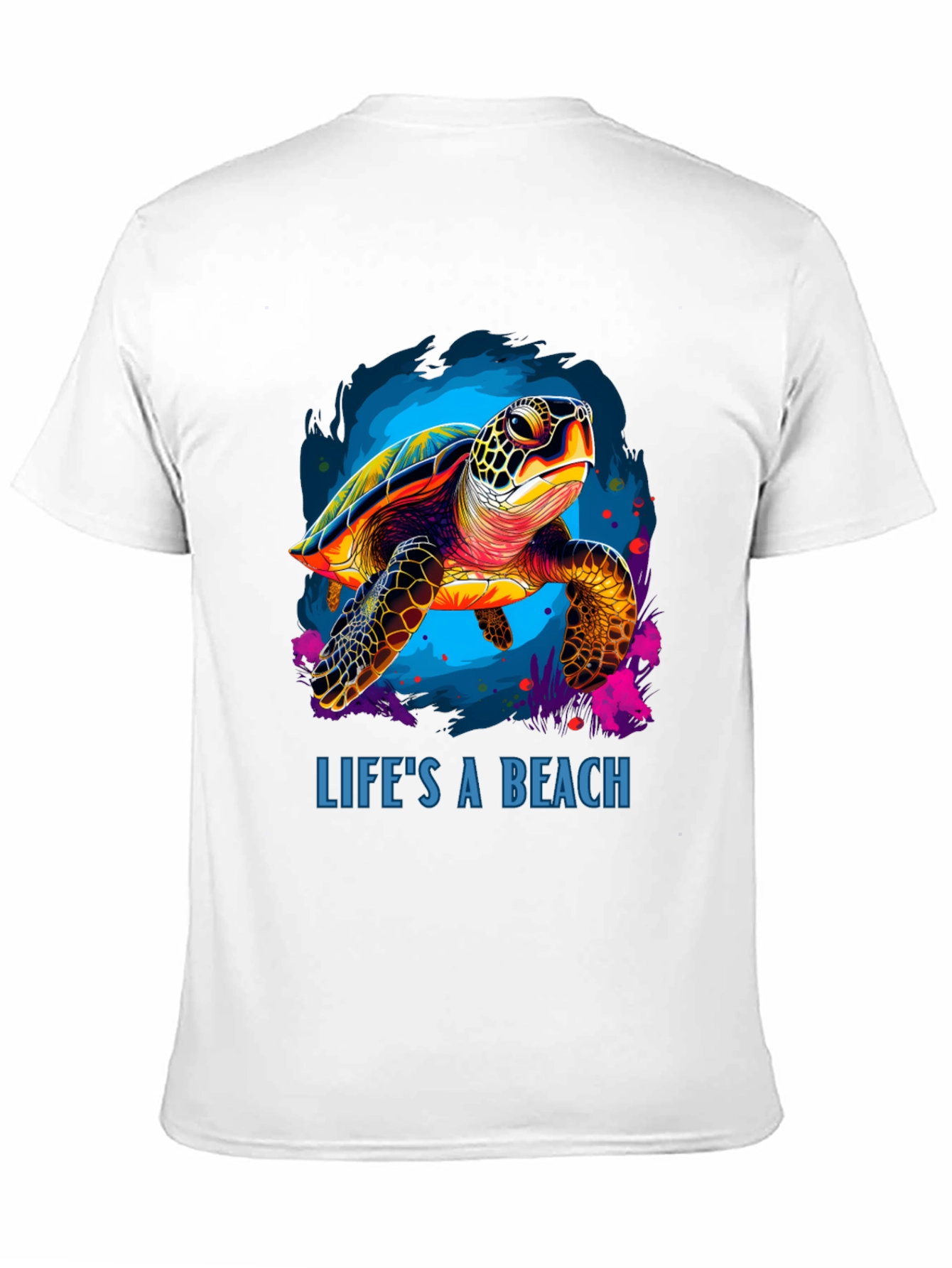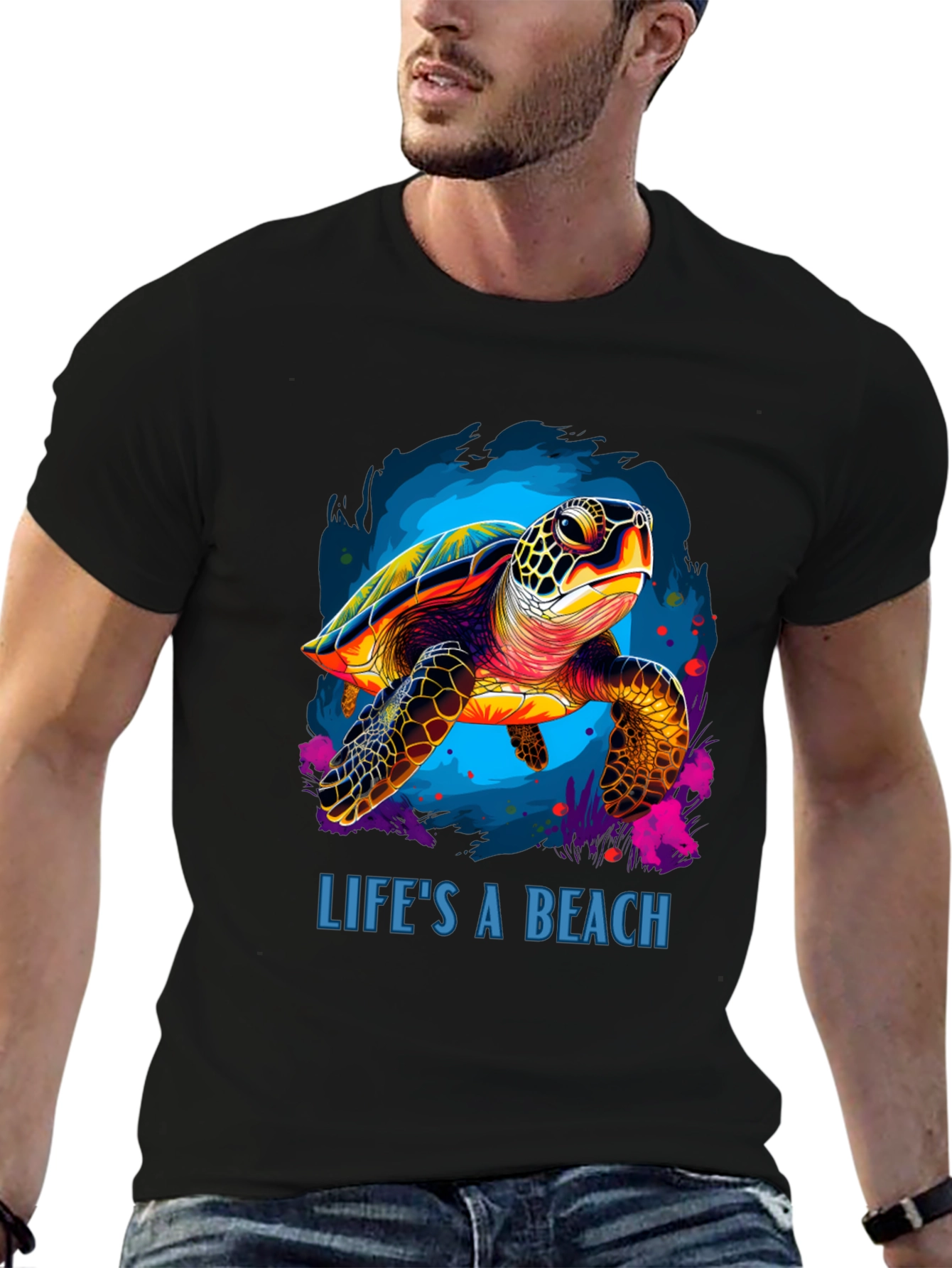 Embrace the island vibes with this eye-catching black t-shirt. A vibrant, artistic turtle graphic takes center stage, set against a backdrop of underwater hues. Below the turtle is the phrase "Life's A Beach". Perfect for casual outings, beach days, or simply adding a touch of coastal charm to your wardrobe. The black color makes it versatile and easy to pair with any outfit. Stand out with this unique and stylish tee!