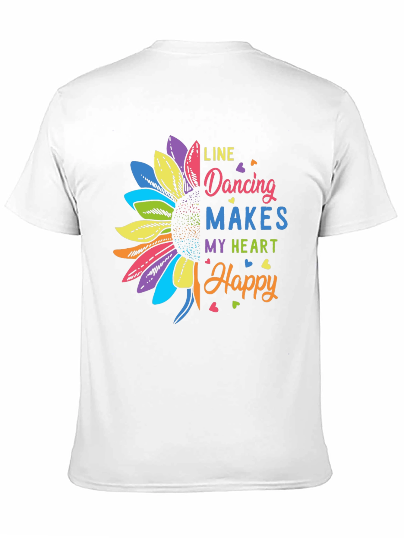 Show off your love for line dancing with this stylish and vibrant graphic T-shirt. Featuring a colorful sunflower design that transitions into the phrase 'Line Dancing Makes My Heart Happy', this tee is perfect for dancers and free spirits alike. The design is printed on a comfortable, classic-fit black tee, ideal for everyday wear or your next dance event. This eye-catching shirt will bring joy and smiles wherever you go. Express your passion with this unique and fun piece!