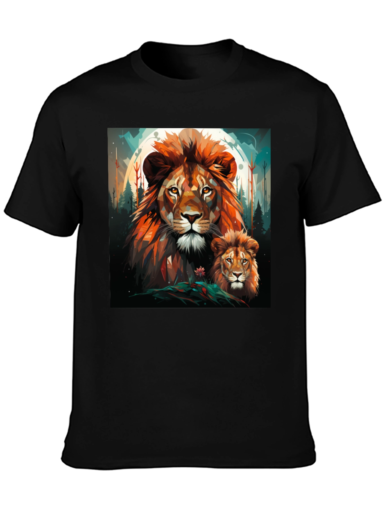 Show your wild side with this striking black T-shirt. The shirt features a vivid graphic print of a majestic lion and cub against a forest and moon backdrop. The design combines sharp, angular lines with warm, earthy tones for a modern artistic effect. Made from a comfortable, breathable fabric, this tee is perfect for everyday wear. Stand out from the crowd with this unique and expressive design. Ideal for casual outings, concerts, or expressing your love for wildlife. A must-have addition to any wardrobe!