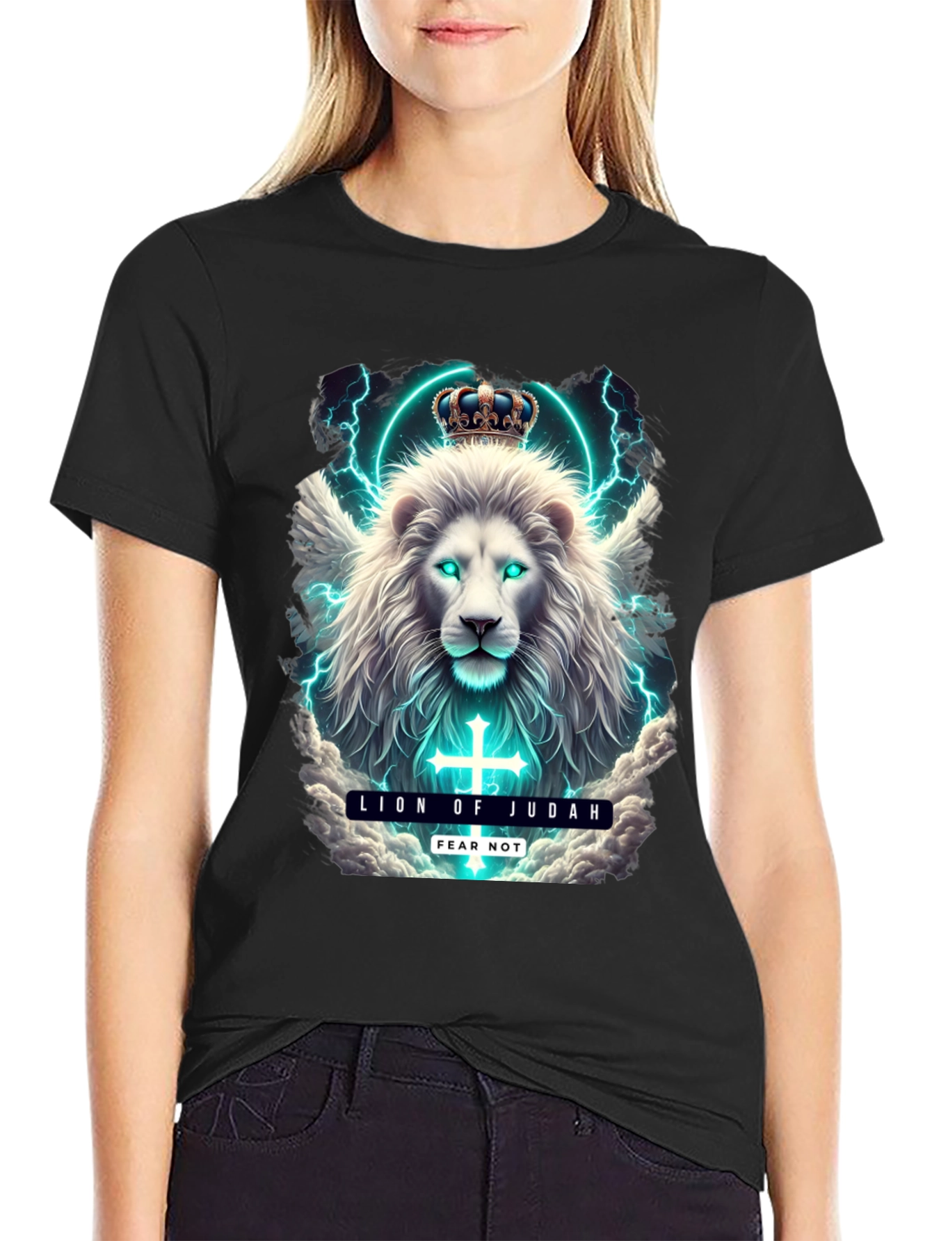 Show your faith with this striking black t-shirt. The design features a majestic white lion wearing a crown, set against a backdrop of glowing blue lightning and clouds. The text 'Lion of Judah' and 'Fear Not' are prominently displayed. The design features a cross that glows. This tee offers both comfort and style. Perfect for everyday wear, church events, or as a meaningful gift. Made from a soft and breathable fabric. This t-shirt is sure to become a wardrobe favorite. Wear your beliefs with pride!