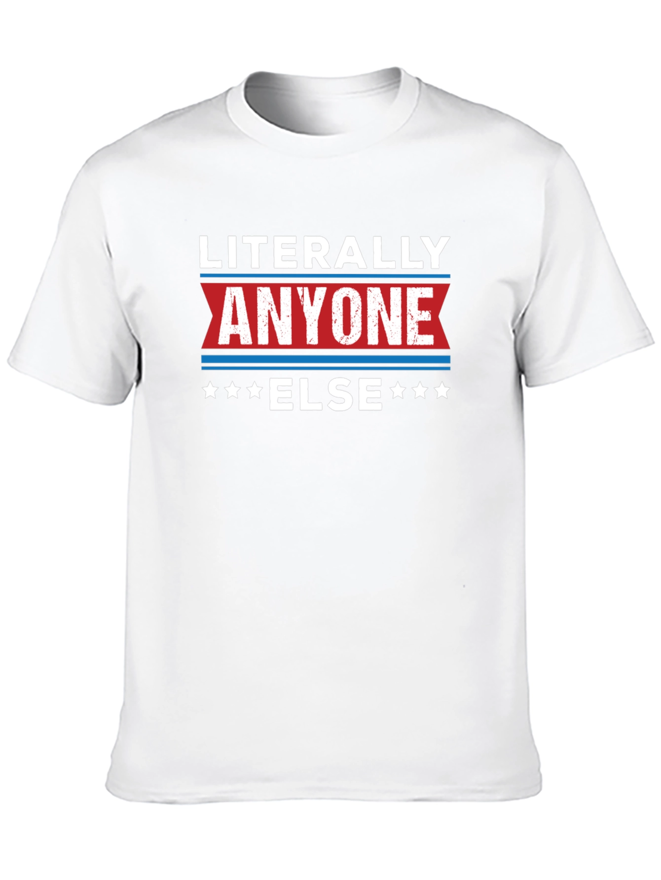 Show your political sentiment with this bold black t-shirt. Featuring the humorous yet pointed slogan "Literally Anyone Else" in crisp white text, accented by red and blue stripes and star details. The design is printed on what appears to be a soft, comfortable cotton blend, perfect for everyday wear. This tee is ideal for rallies, casual outings, or making a statement wherever you go. A great way to spark conversation and express your views with a touch of humor. Get yours today and let your clothing do the talking!