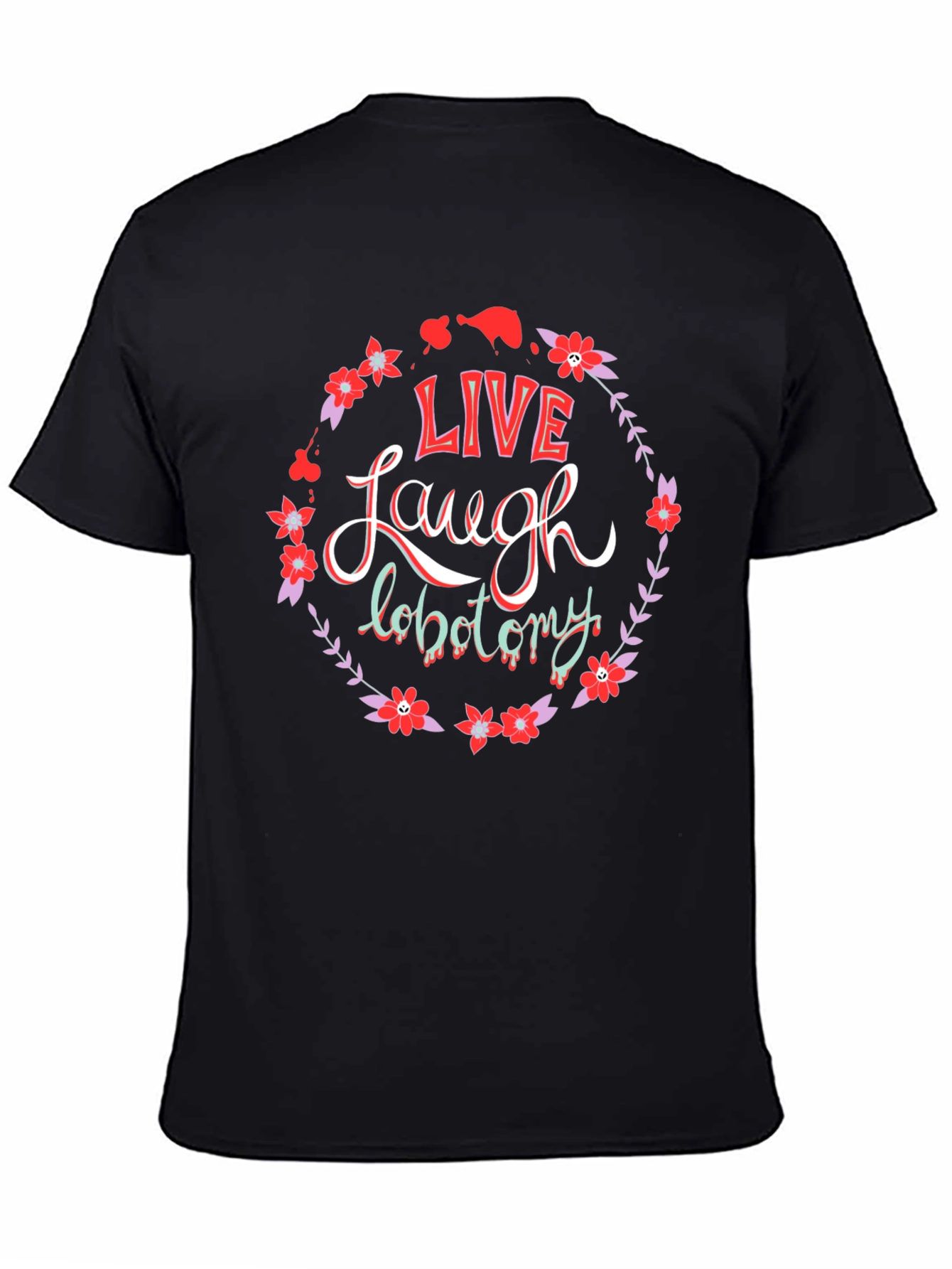 Express your quirky sense of humor with this unique graphic t-shirt. The shirt features a whimsical design of "Live Laugh Lobotomy" encircled by a floral wreath. The playful lettering is complemented by colorful flowers, creating a striking visual contrast against the black t-shirt. Made from a soft, comfortable fabric, this tee is perfect for everyday wear and is sure to spark conversations. Ideal for casual outings, concerts, or as a fun statement piece. Embrace your individuality and stand out from the crowd with this eye-catching and thought-provoking graphic tee.