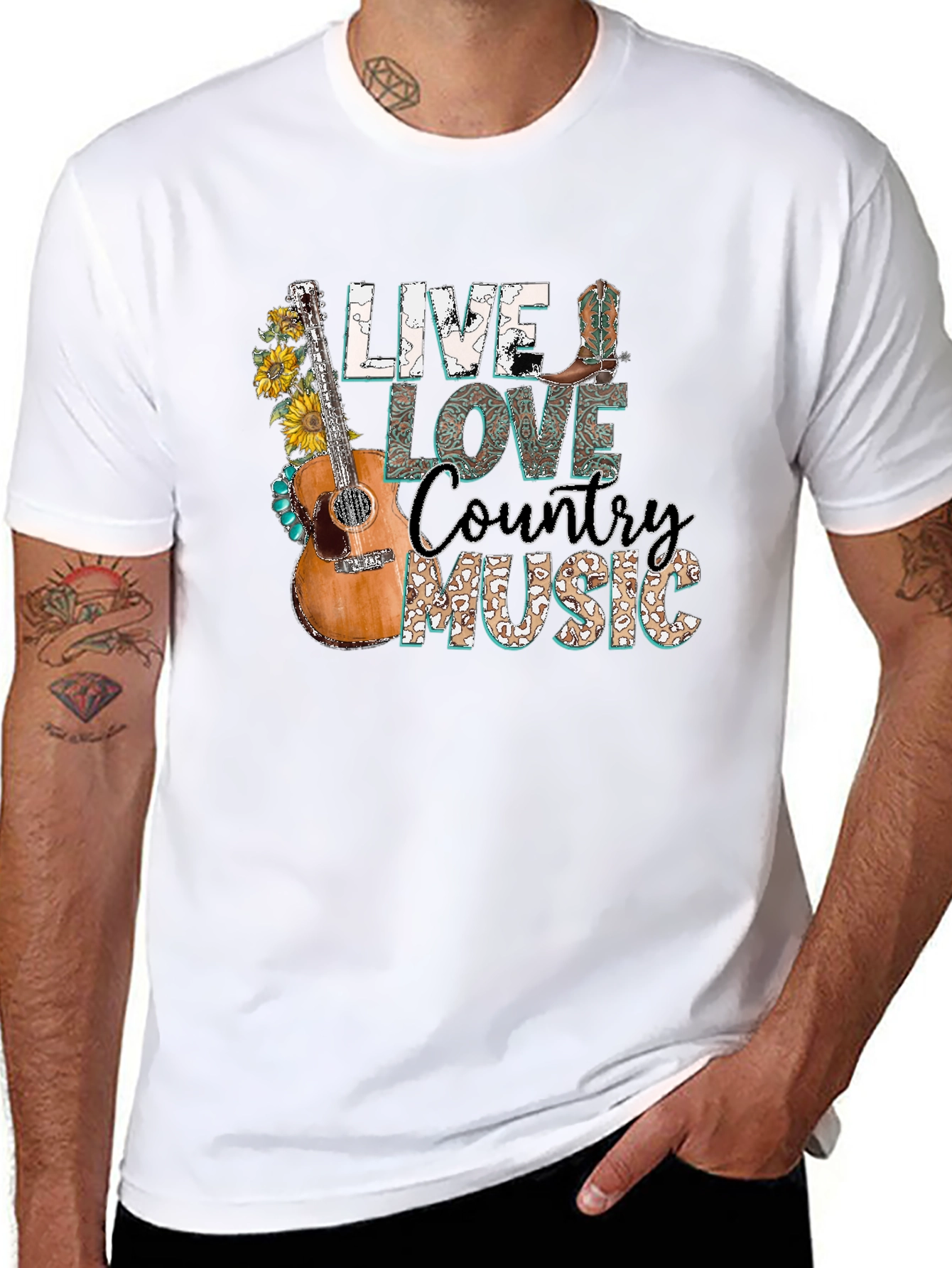 Show off your love for country music with this stylish graphic tee. The shirt features a vibrant design incorporating sunflowers, a guitar, and a cowboy boot, along with the words 'Live Love Country Music' in a decorative font. Crafted from a comfortable and breathable black fabric, this tee is perfect for casual wear, concerts, or showing off your country pride. The unique graphic makes a statement, while the classic fit ensures all-day comfort. Add this standout piece to your wardrobe and let your love for country music shine!