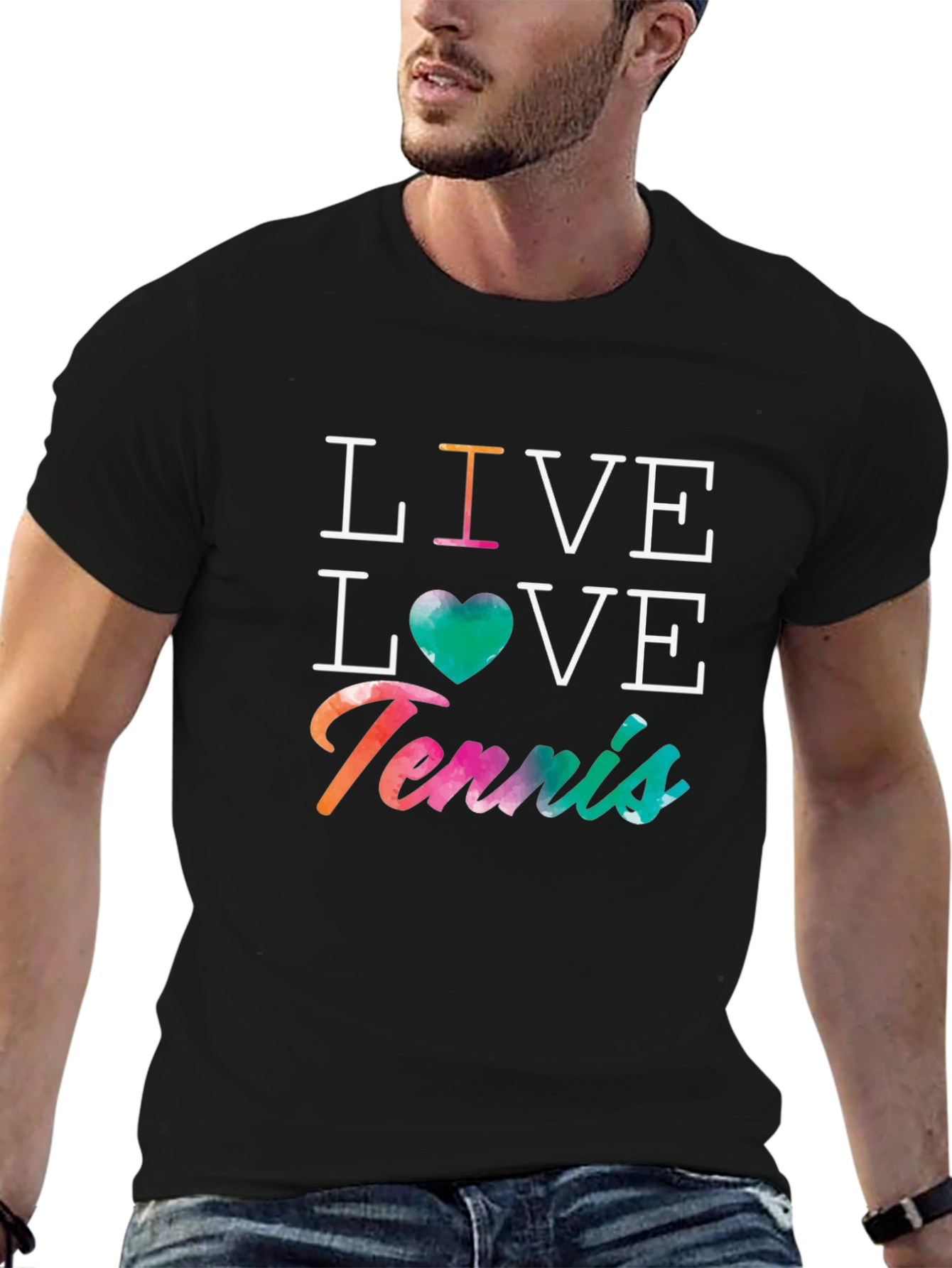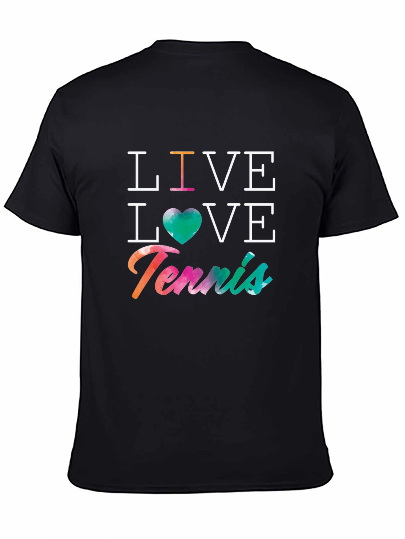 Showcase your love for tennis with this stylish black graphic tee! Featuring the words "Live Love Tennis" in a vibrant, eye-catching design, this shirt is perfect for tennis enthusiasts. The word "Live" is vertically stacked on top of a green heart and the word Love which is stacked on top of "Tennis" that is printed in vibrant colors. The comfortable, classic fit makes it ideal for everyday wear, whether you're on the court or just hanging out. Made from soft, breathable fabric, this tee ensures all-day comfort. A must-have addition to any tennis fan's wardrobe!