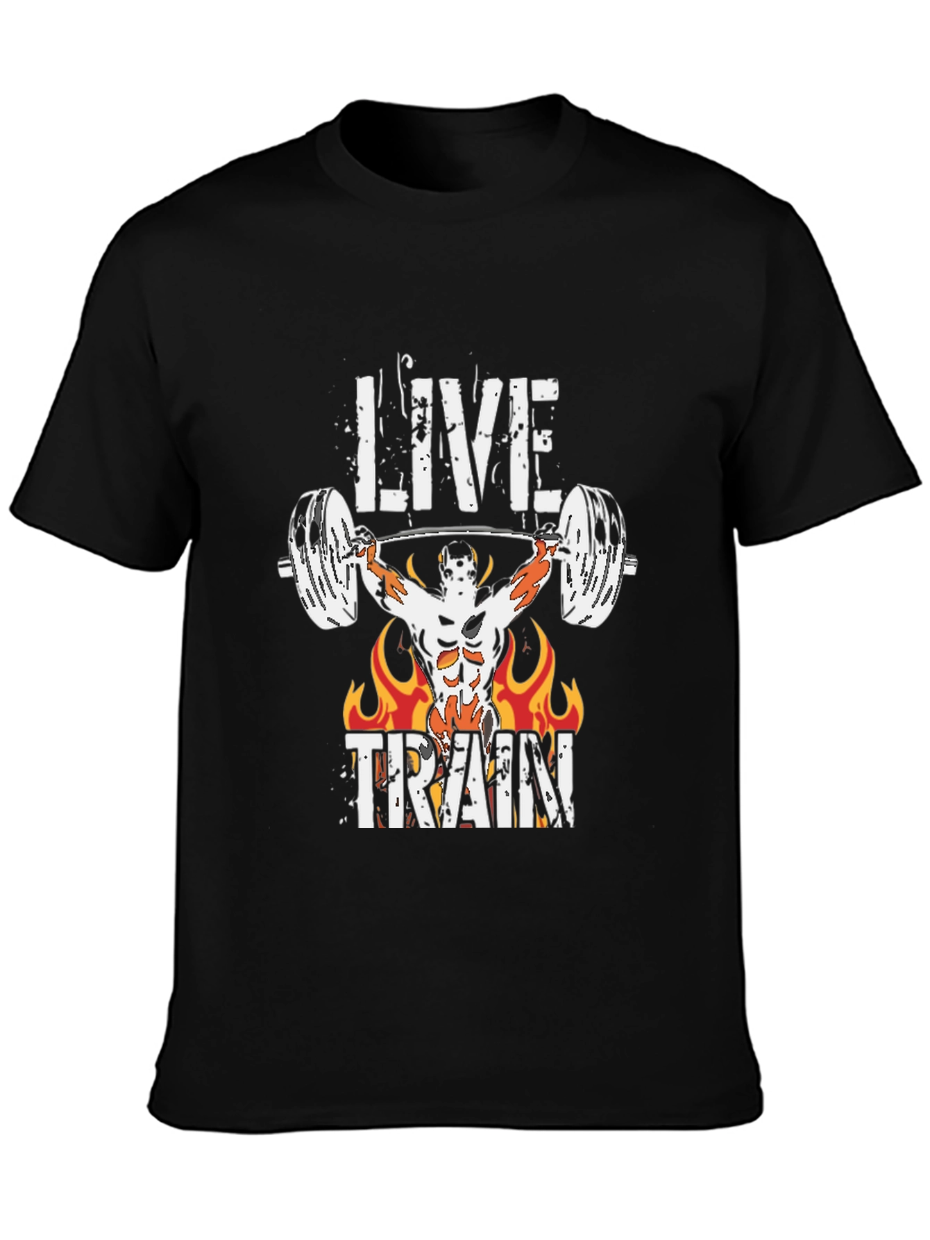 Show off your dedication to fitness with this striking black graphic tee. Featuring a bold design of a weightlifter engulfed in flames, with the words 'LIVE' and 'TRAIN' in a distressed font. This T-shirt not only looks great but also inspires motivation. Perfect for gym sessions, casual wear, or as a gift for fitness enthusiasts. Made from soft, breathable fabric for maximum comfort and style. It's more than just a shirt; it's a statement.