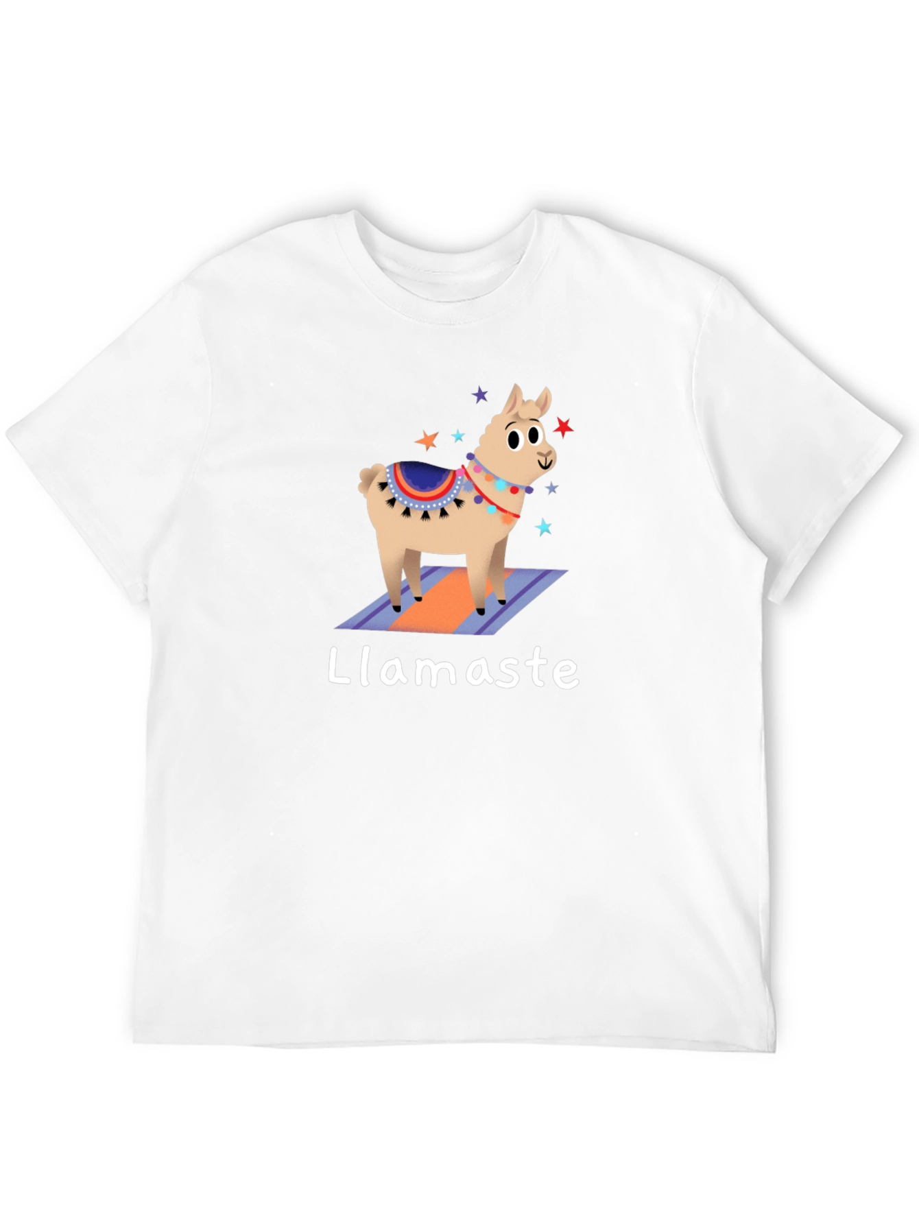 This black graphic tee features a charming cartoon llama standing on a yoga mat, surrounded by colorful stars. The word 'Llamaste' is printed below the llama, adding a playful twist to the yoga theme. The T-shirt is made of a comfortable fabric, perfect for casual wear or a light workout. The llama is adorned with a vibrant saddle blanket and a colorful beaded necklace, adding to its whimsical appeal. This shirt is ideal for yoga enthusiasts, llama lovers, or anyone who enjoys fun and quirky designs. Wear it to your next yoga class, a casual outing, or simply as a fun conversation starter.