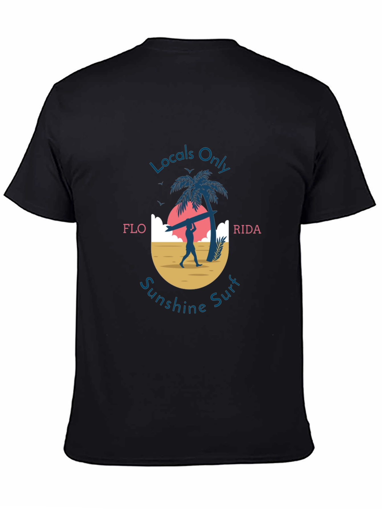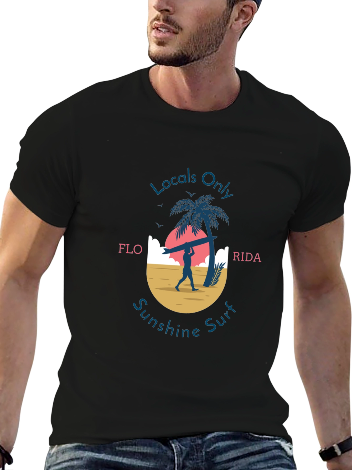 Embrace the coastal lifestyle with this eye-catching graphic tee! Featuring a vibrant design, the shirt showcases a silhouette of a surfer heading towards the beach under a palm tree. The text "Locals Only Florida Sunshine Surf" encircles the graphic, creating a cool and relaxed vibe. Made from a soft, breathable fabric, this t-shirt is perfect for everyday wear, beach trips, or casual outings. Pair it with shorts or jeans for an effortlessly stylish look. Show off your love for the sun, sand, and surf with this must-have tee!