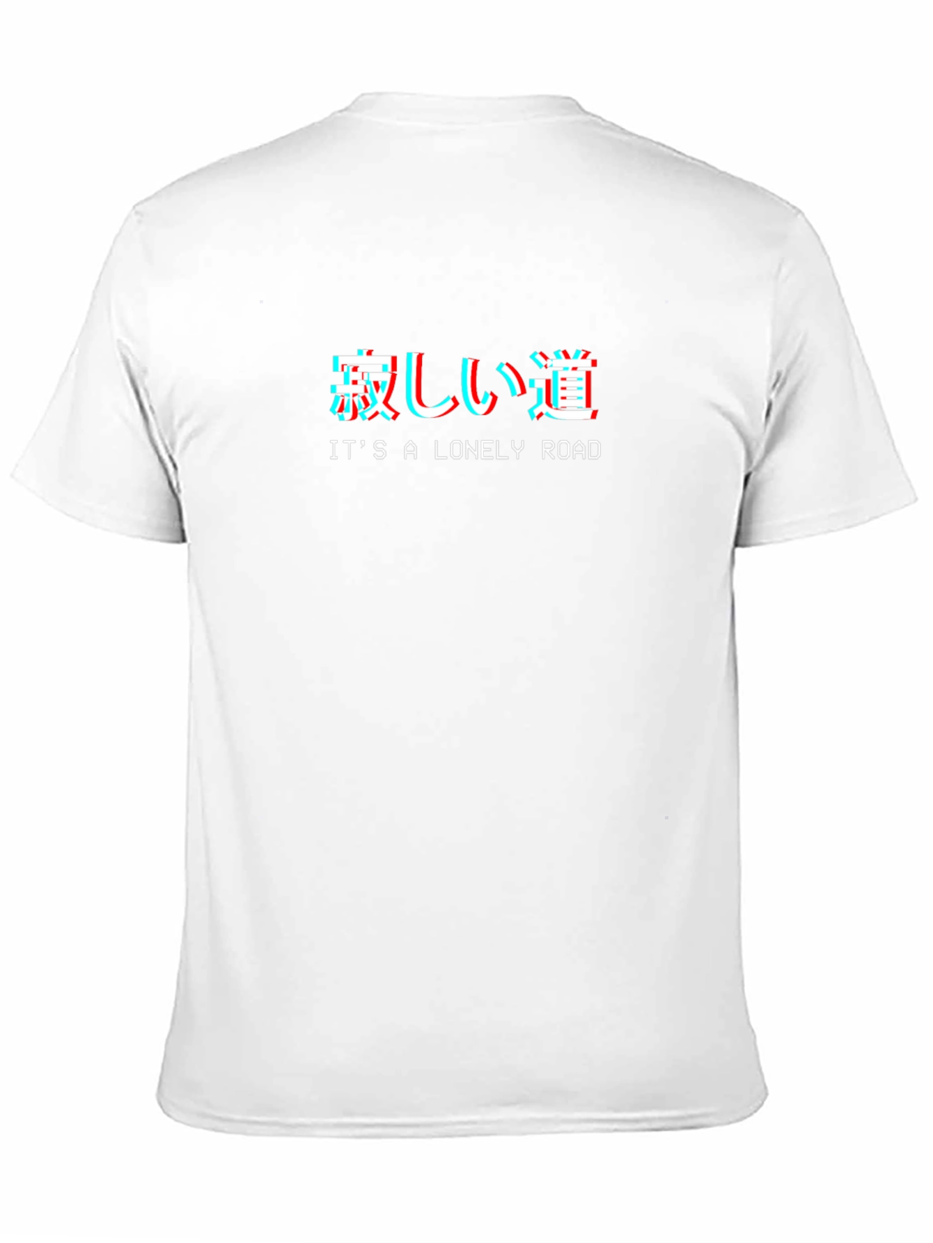 Embrace solitude with this unique black t-shirt. Featuring eye-catching Japanese text with a cool 3D glitch effect above the English translation, "It's a Lonely Road," this shirt makes a statement. Crafted from a soft, comfortable fabric, it offers a relaxed fit for all-day wear. The classic black color ensures versatility, easily pairing with jeans, shorts, or joggers. Perfect for casual outings, concerts, or expressing your introspective side, this tee is a must-have for those who appreciate stylish comfort with a touch of individuality. Elevate your wardrobe with this standout graphic tee today!