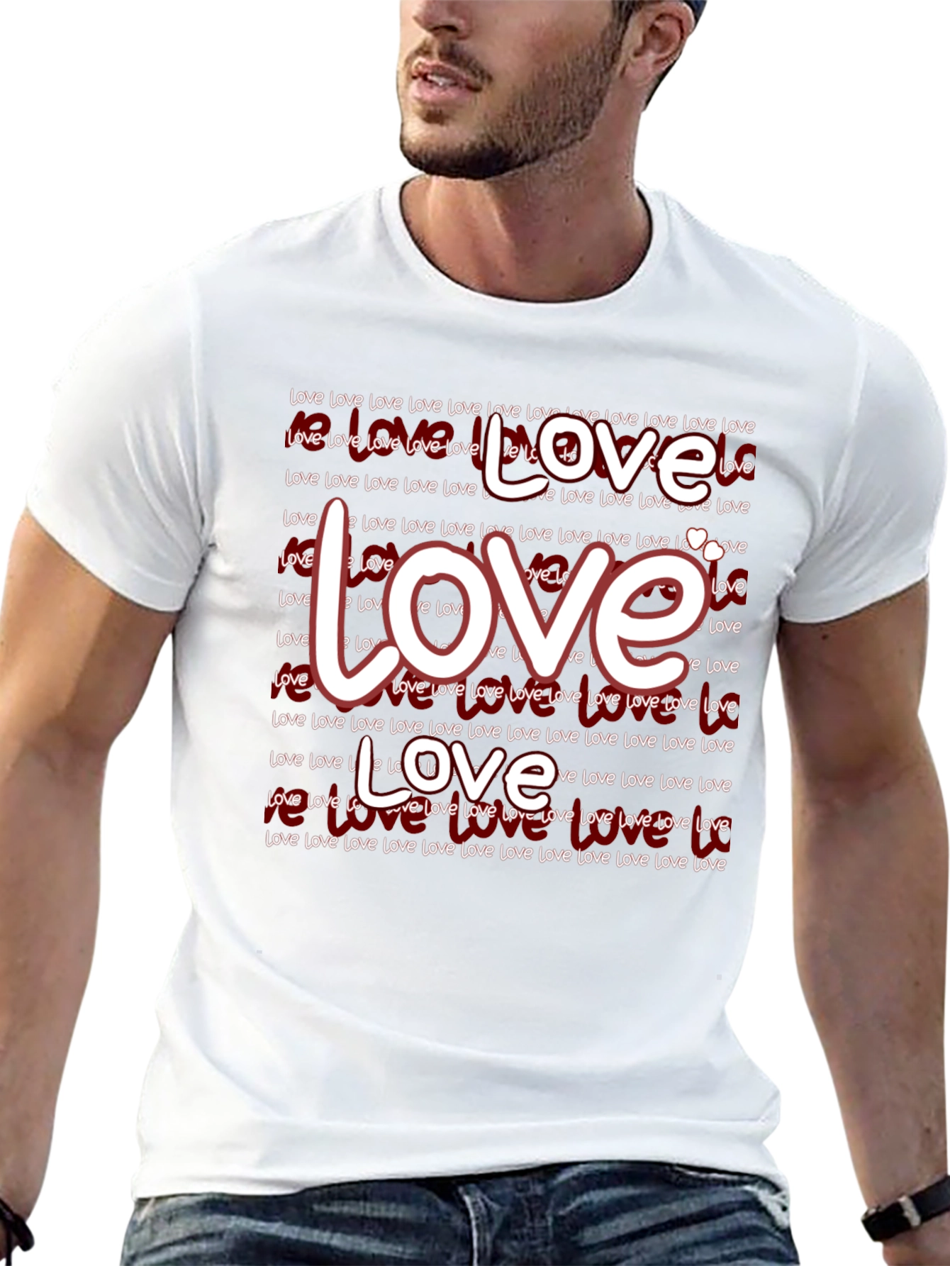 Showcase your love with this stylish black graphic print t-shirt. The shirt features the word 'Love' repeated across the design, creating an eye-catching and unique pattern. The word 'Love' in larger font overlaying the repeating graphic is the focal point. Made from a comfortable, breathable fabric, this tee is perfect for everyday wear or a special Valentine's Day outing. Its relaxed fit ensures all-day comfort, while the bold design makes a statement. Pair it with jeans or shorts for a casual look that expresses your feelings with style.