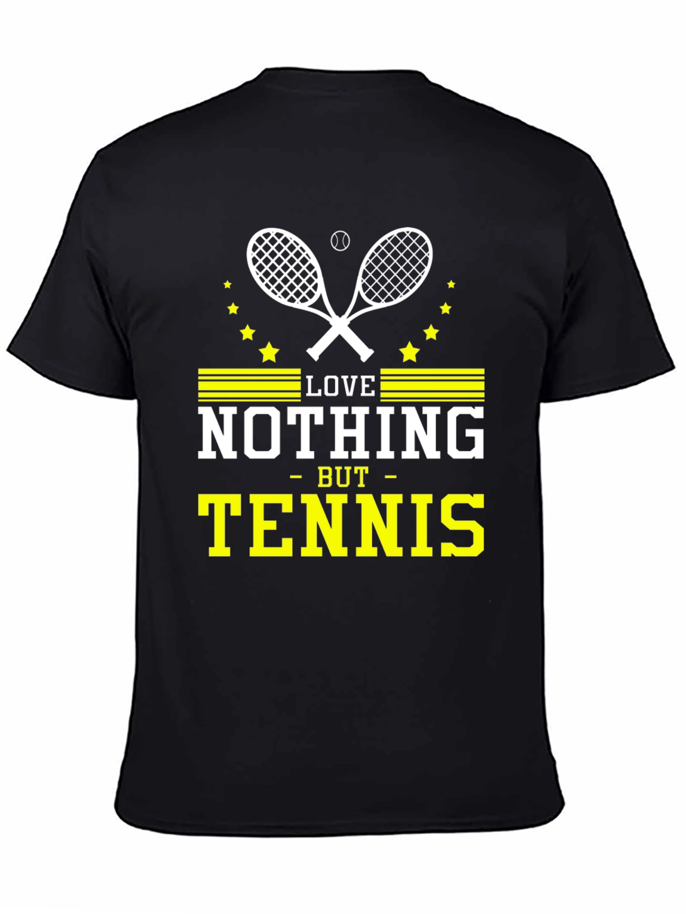 Show off your passion for tennis with this stylish black t-shirt. The design features two crossed tennis rackets and a tennis ball, surrounded by yellow stars above the statement "LOVE NOTHING - BUT - TENNIS" in a bold, eye-catching font. The yellow stripes add a sporty touch. Perfect for casual wear or to wear to your next match. This tee is great for tennis players and enthusiasts. Available in a range of sizes, it makes a great gift for the tennis lover in your life. Get yours today!