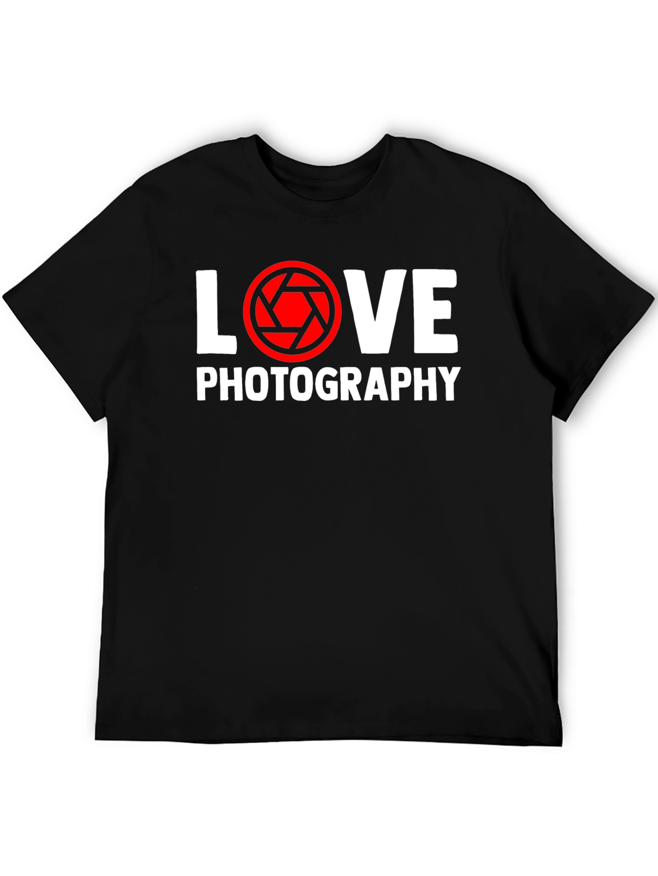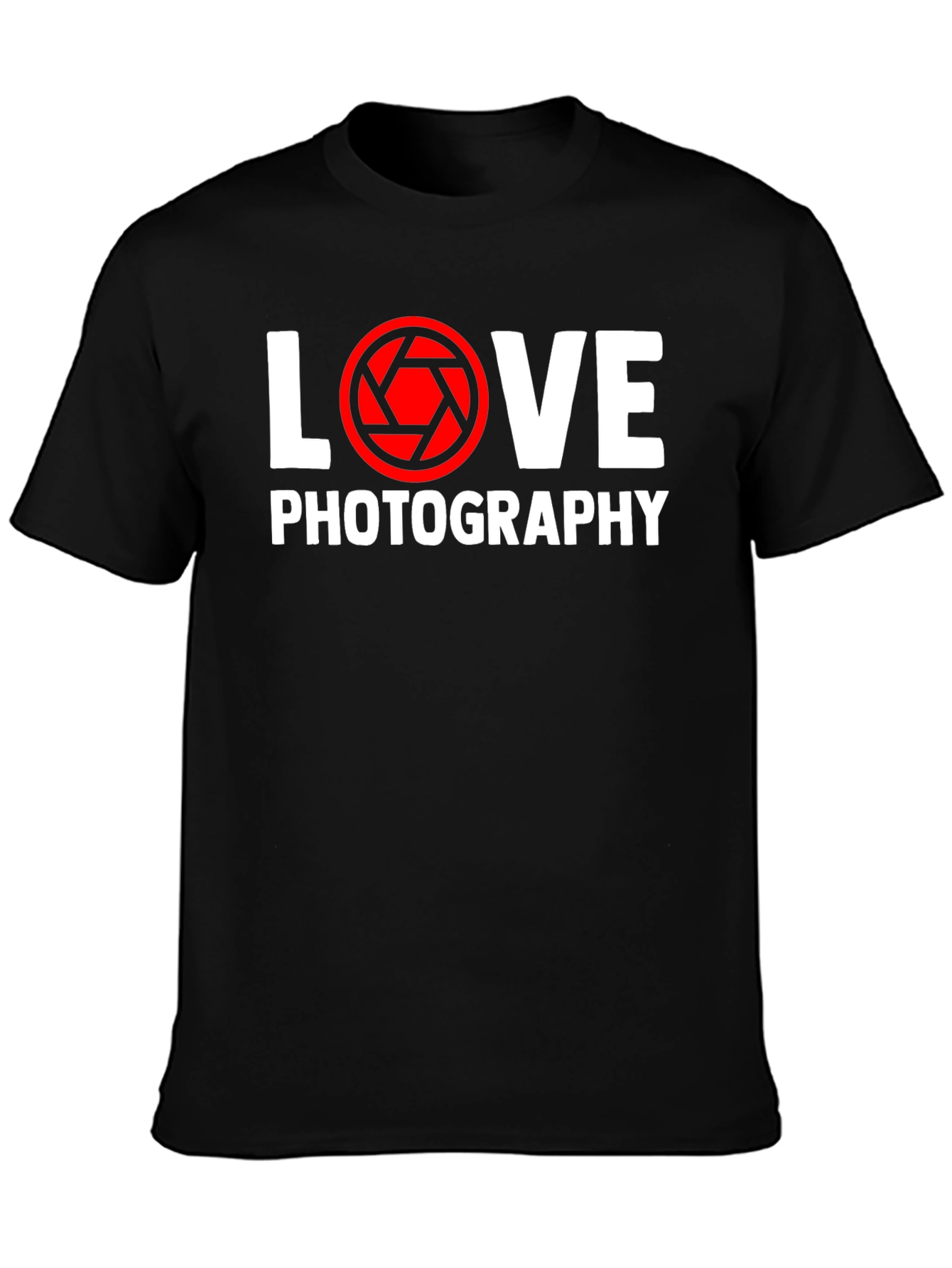 Show your passion for photography with this stylish black t-shirt. This tee features a striking design with the word 'LOVE' prominently displayed, where the 'O' is cleverly replaced by a red camera lens aperture graphic. Below, the word 'PHOTOGRAPHY' is printed in bold white letters, making a clear statement. Crafted from comfortable materials, this shirt is perfect for casual wear, photography events, or as a gift for photography enthusiasts. Express your love for capturing moments in style. Ideal for photographers of all skill levels.