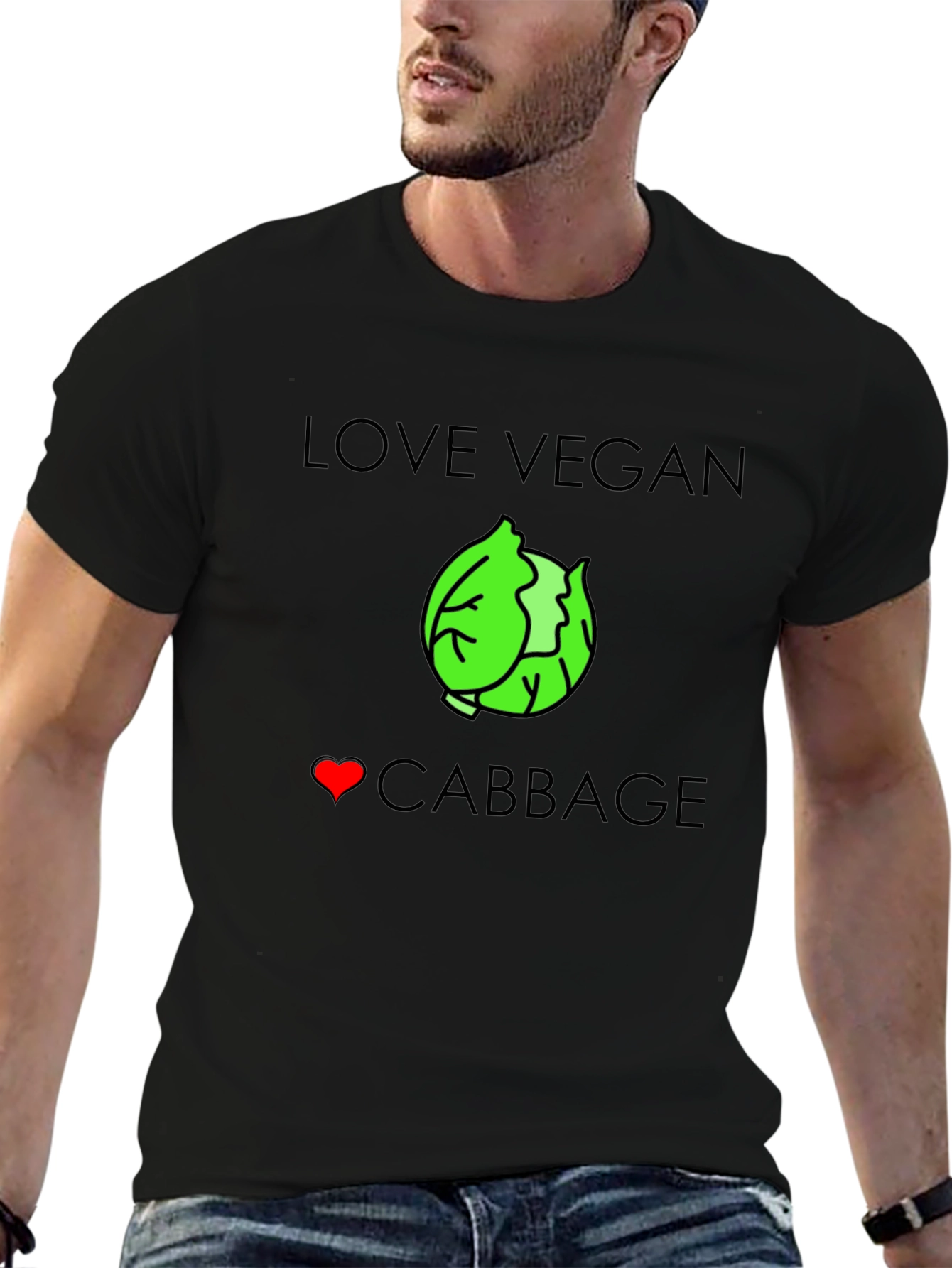 Show off your love for veganism and cabbage with this stylish black t-shirt! Featuring a unique design with the words "LOVE VEGAN" above a bright green cabbage graphic and "❤ CABBAGE" below, this tee is perfect for any plant-based enthusiast. Made from a comfortable and breathable fabric, it's ideal for everyday wear, casual outings, or even a visit to the farmer's market. The classic crew neck and short sleeve design ensures a relaxed fit. Let everyone know that you are vegan and love cabbage with this cool statement tee!