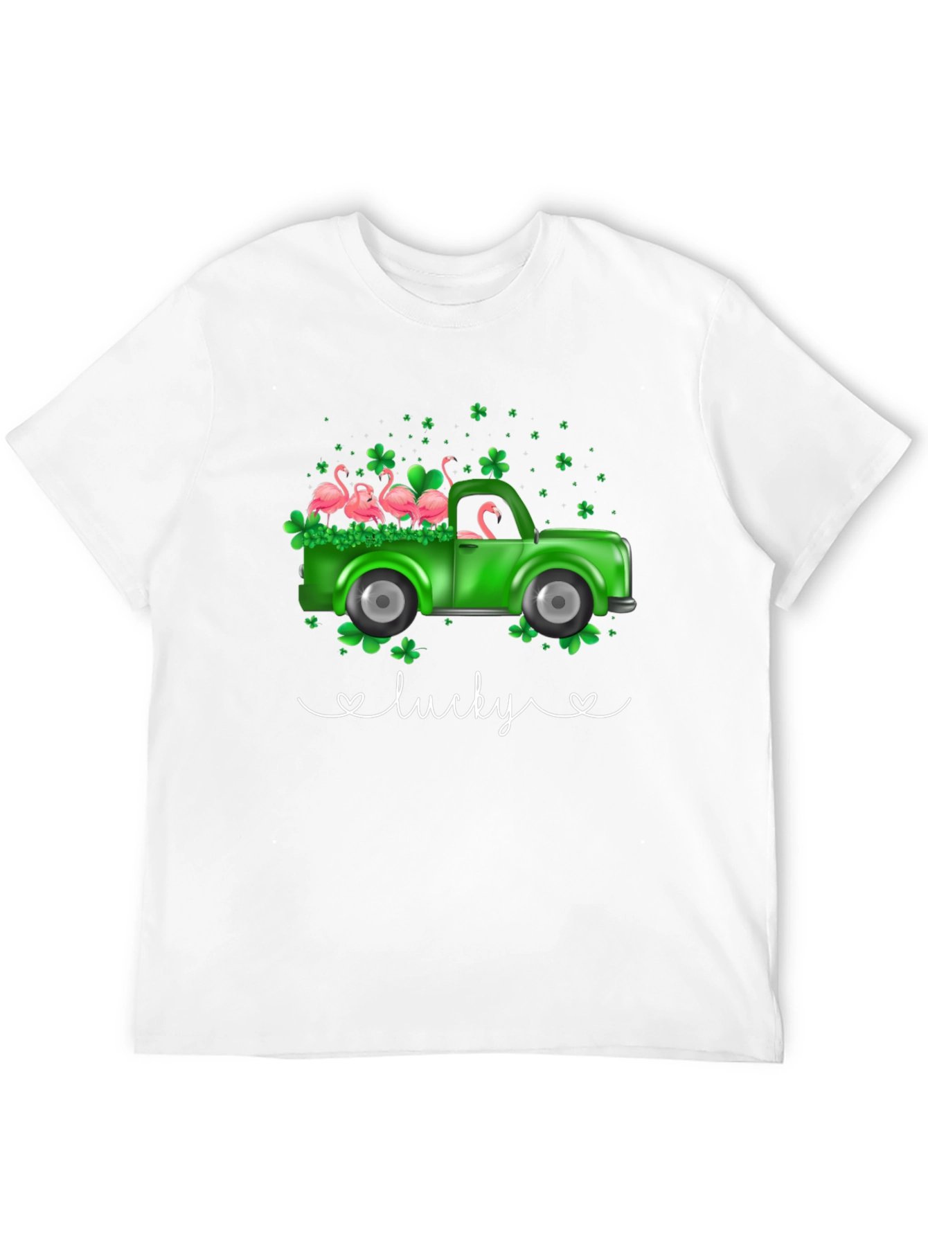 Show off your fun personality with this eye-catching black graphic tee! Featuring a vibrant green pickup truck filled with pink flamingos and shamrocks, this shirt celebrates luck and whimsy. The word "lucky" is written in a cursive script below the truck, adding a touch of charm. Perfect for casual outings, St. Patrick's Day festivities, or just expressing your unique style. Made from a soft and breathable fabric, this tee ensures comfort all day long. Make a statement and spread some good vibes with this must-have addition to your wardrobe!