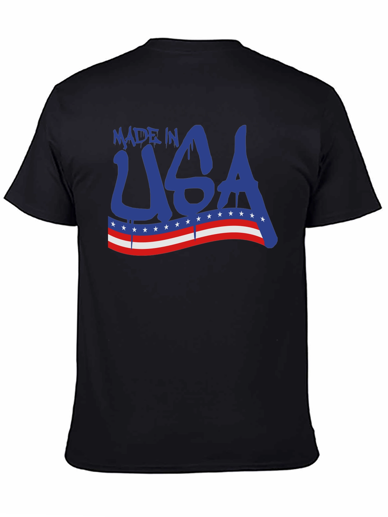 Show your American pride with this stylish black t-shirt. The bold "Made in USA" graphic features a dynamic blue design, complemented by a red and white stripe accented with white stars, reminiscent of the American flag. This comfortable tee is perfect for casual wear, holidays like the 4th of July, or simply expressing your love for the USA. Its eye-catching design is sure to make a statement. Wear it with jeans, shorts, or anything casual for a patriotic touch.