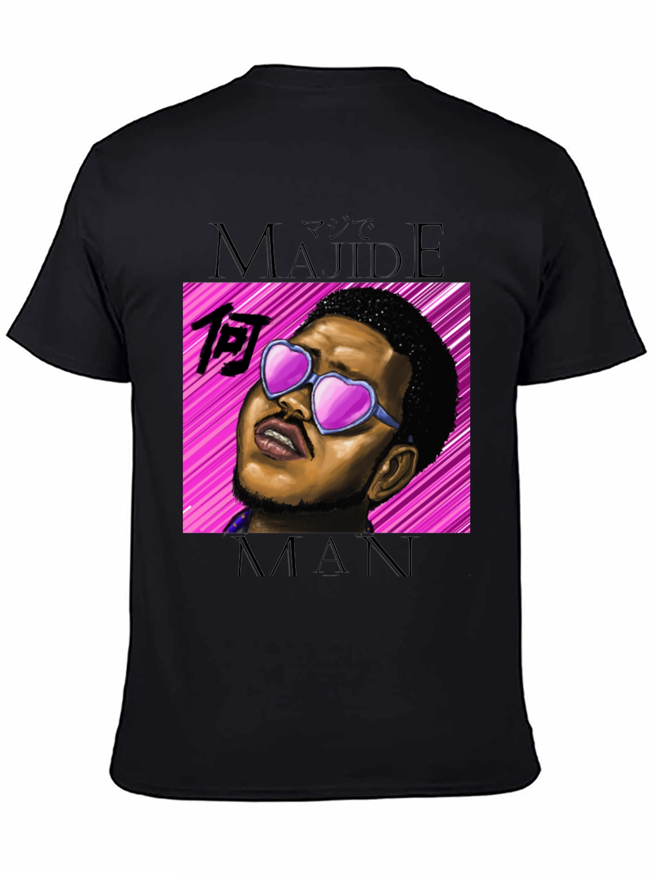 Rock this eye-catching Majideman graphic tee, featuring a bold and stylish design. The black t-shirt showcases a vibrant illustration of a man wearing pink heart-shaped sunglasses, set against a pink backdrop. The design also includes Japanese lettering, adding a unique cultural flair. Made from comfortable, breathable fabric, this tee is perfect for casual outings, concerts, or expressing your individuality. Elevate your streetwear game and make a statement with this must-have piece. Pair it with jeans, joggers, or shorts for a cool, effortless look.