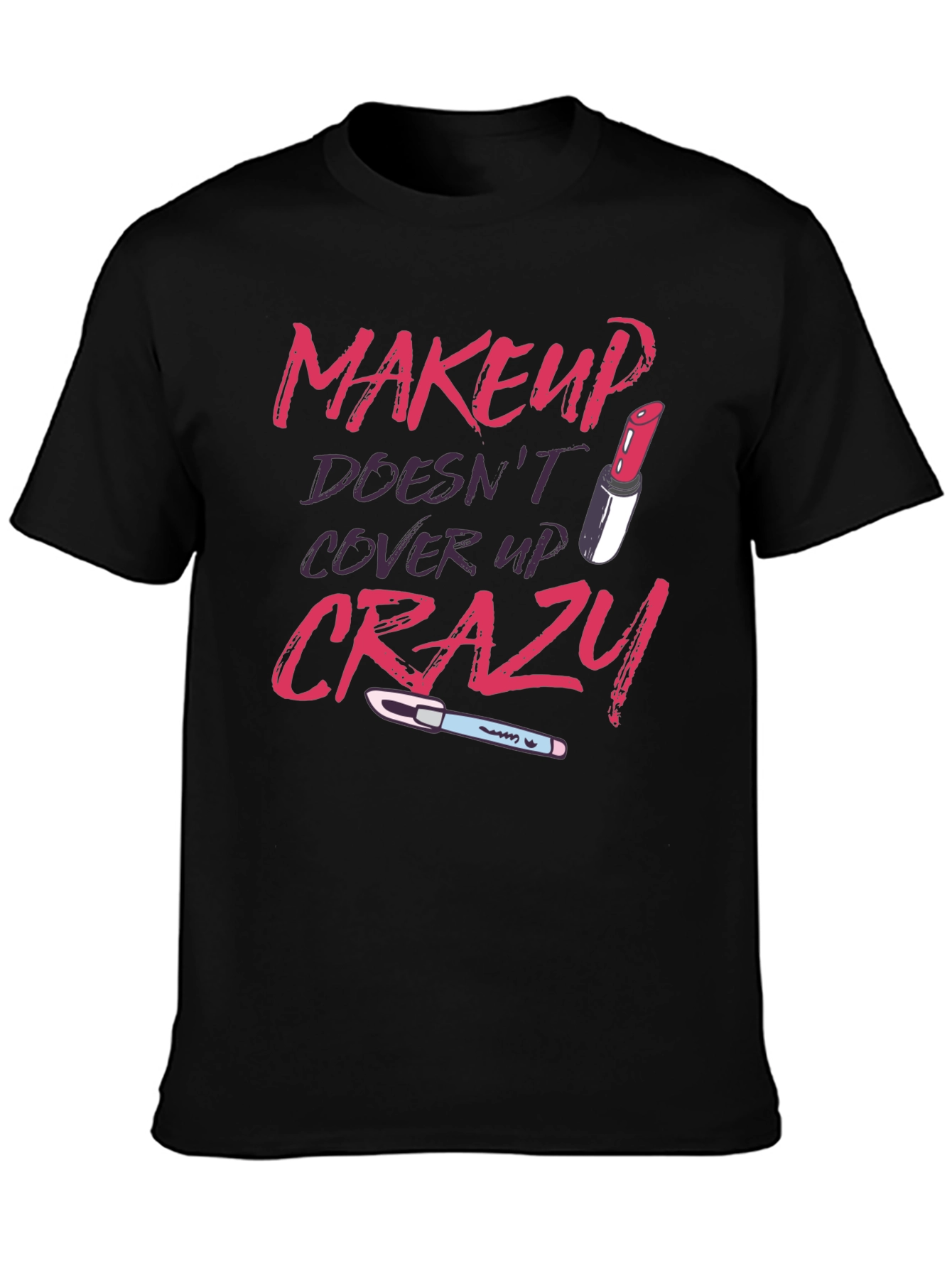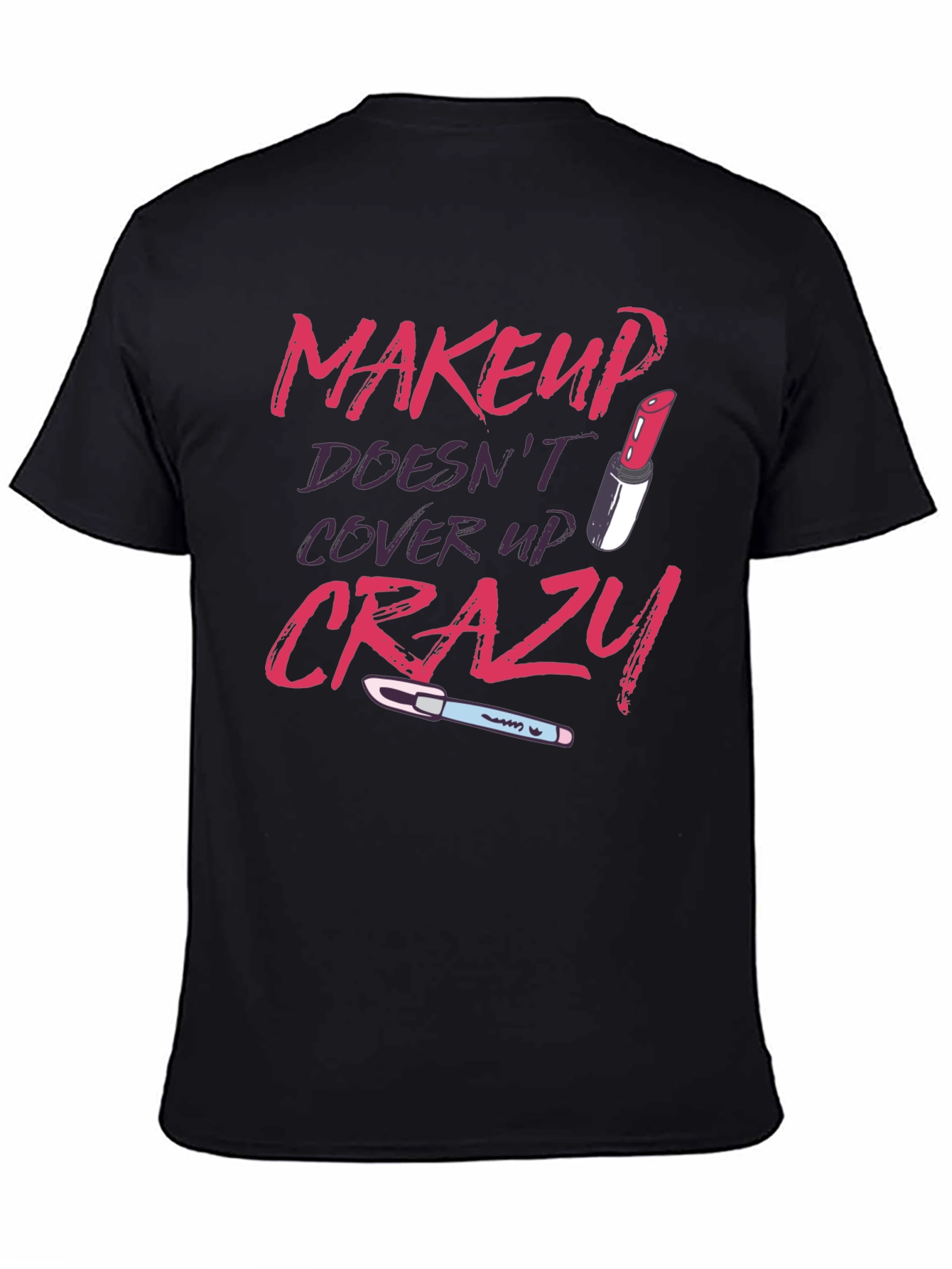 Show off your witty side with this bold graphic t-shirt. Made from comfortable, breathable fabric, this black tee features a playful design with the phrase "Makeup Doesn't Cover Up Crazy" in a vibrant, eye-catching font. Accented with a stylish lipstick and eyeliner illustration, this shirt is perfect for makeup lovers and those with a fun sense of humor. Ideal for casual outings, social gatherings, or just lounging at home, this tee is a statement piece that sparks conversation and adds a touch of personality to any outfit. The classic fit makes it a versatile addition to your wardrobe. Get yours today and let your style do the talking!