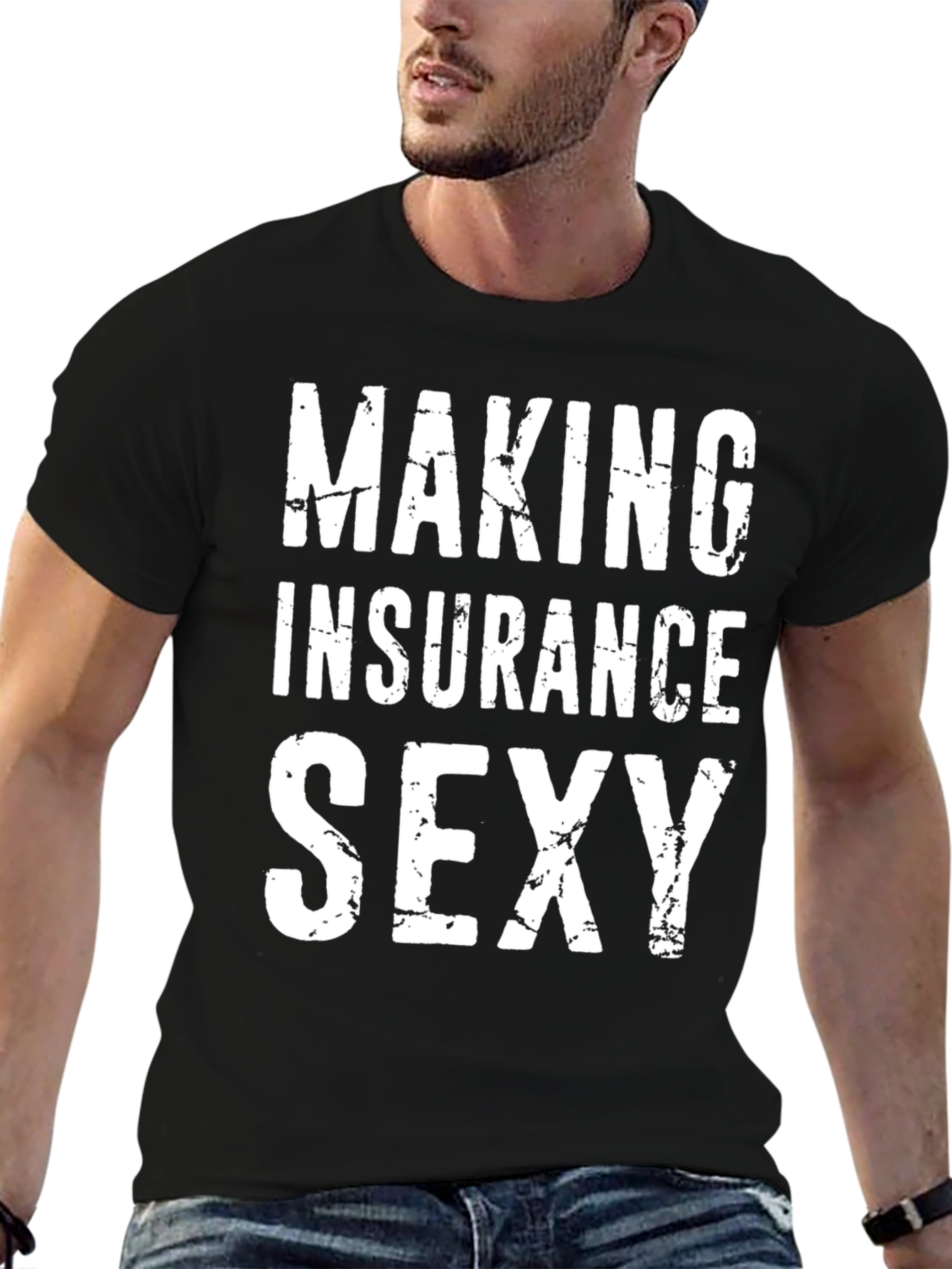 Show off your confidence with this black graphic tee. This stylish shirt features the phrase "Making Insurance Sexy" in bold, distressed white text. The classic black color and comfortable fit make it perfect for casual wear. Whether you're heading to a social gathering or just hanging out with friends, this tee is sure to turn heads and spark conversations. Made with breathable fabric, it provides all-day comfort. Makes a great gift for insurance professionals with a sense of humor.