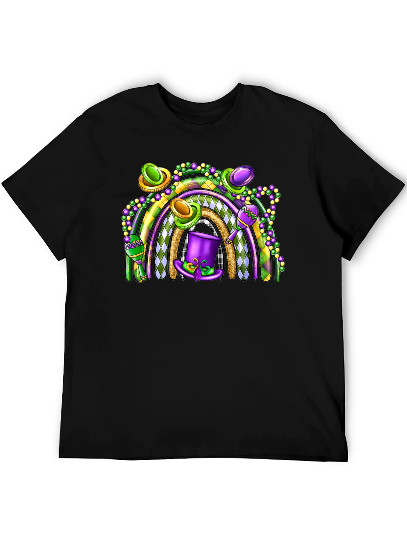Celebrate Mardi Gras in style with this eye-catching graphic tee! This black t-shirt features a vibrant rainbow design adorned with traditional Mardi Gras elements. You'll spot hats, maracas, and strings of beads in classic green, purple, and gold hues. The festive graphic creates a fun and playful look, perfect for parties, parades, or casual wear. Made from a soft, comfortable fabric, this tee is sure to become a favorite in your wardrobe. Show off your Mardi Gras spirit with this unique and stylish t-shirt!