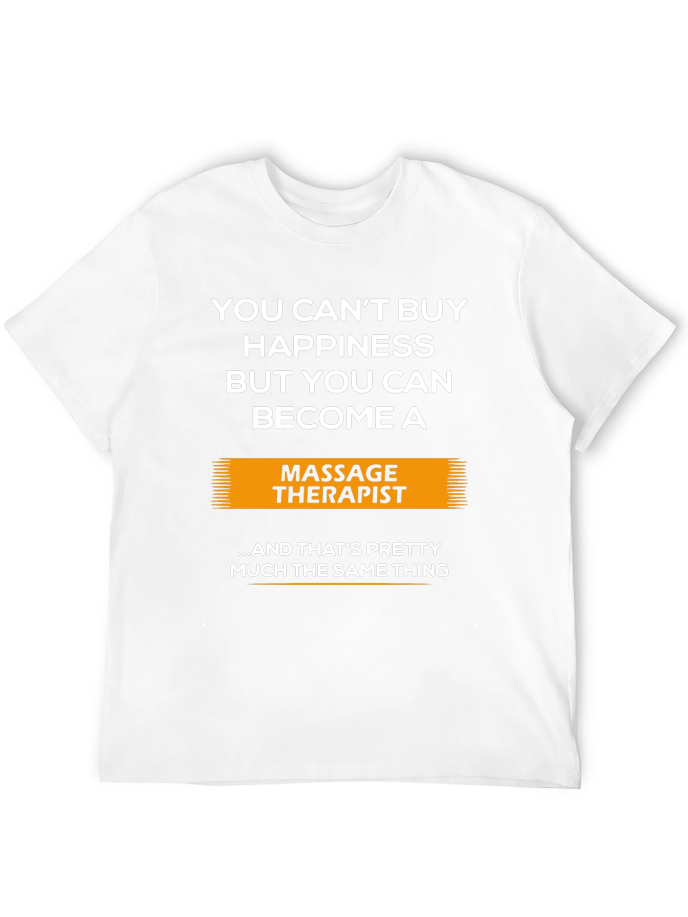 This black T-shirt features a witty and humorous design for massage therapists. The shirt declares "YOU CAN'T BUY HAPPINESS BUT YOU CAN BECOME A MASSAGE THERAPIST" in bold, white lettering, making it a fun and playful garment. An orange rectangular graphic underlines the words "MASSAGE THERAPIST". The shirt has a relaxed fit. This tee is perfect for wearing to work, casual outings, or as a gift for the massage therapist in your life. Show off your passion for massage therapy with this unique and comfortable T-shirt!