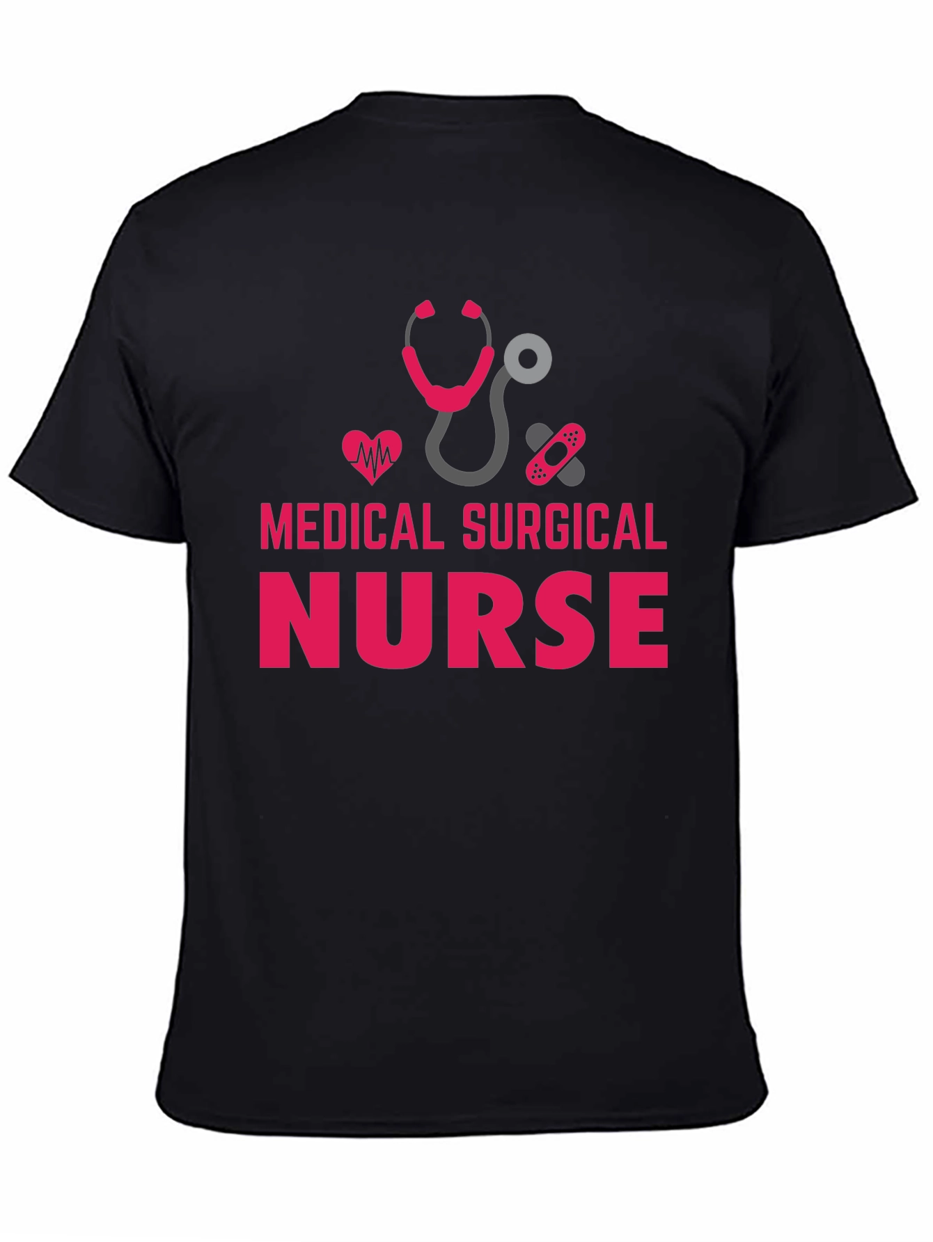 Show your appreciation for medical professionals with this stylish black t-shirt! This tee features a playful design with a stethoscope, heartbeat graphic, and a bandage. The words 'Medical Surgical Nurse' are prominently displayed in a bold, eye-catching pink, making a statement. Made from a soft and comfortable fabric, this t-shirt is perfect for everyday wear or as a thoughtful gift for the dedicated nurse in your life. It's a great way to express support and admiration for the hard work and dedication of medical professionals. Wear it proudly in and out of the medical field.