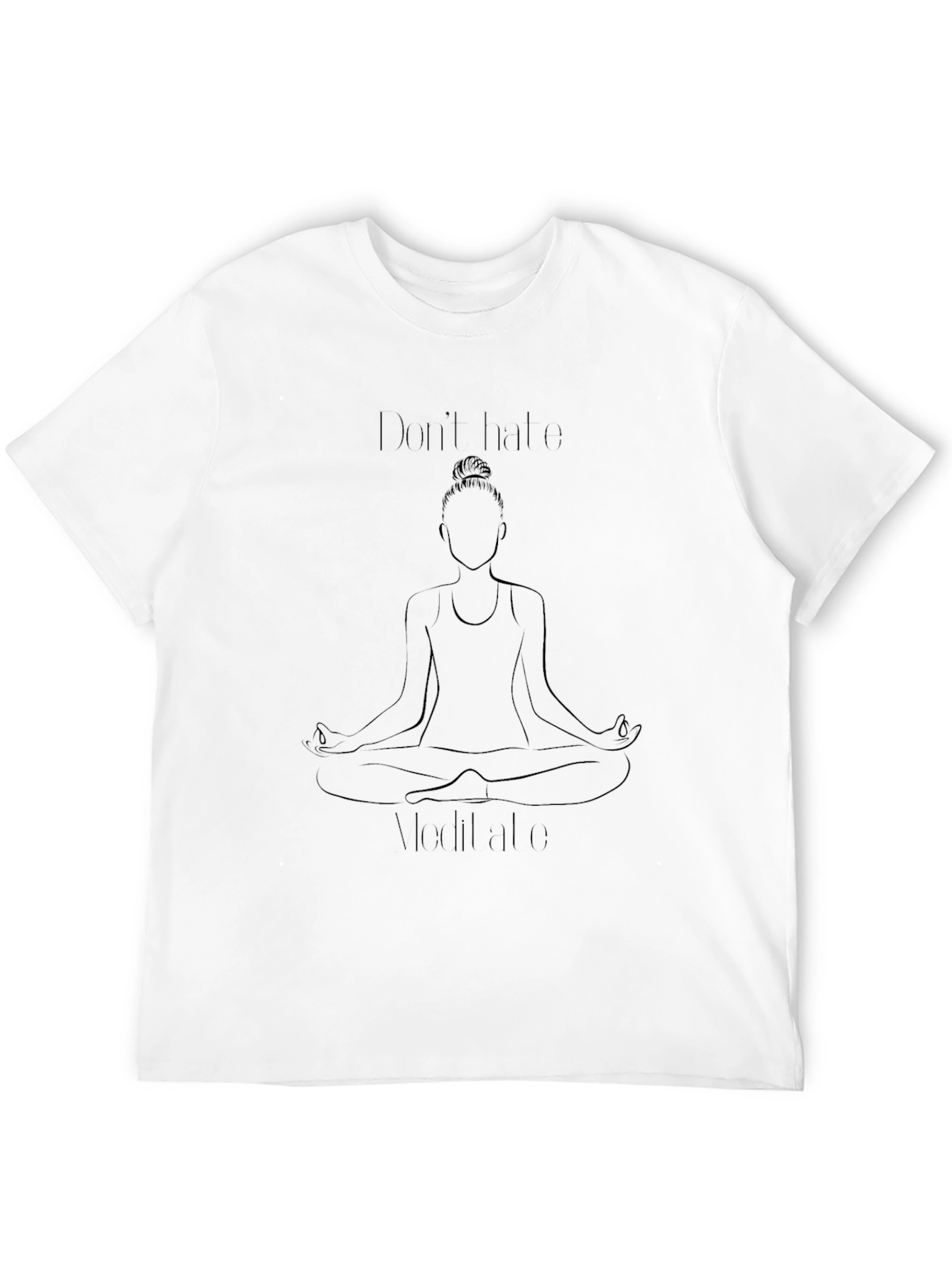 This black t-shirt features a minimalist design with the words "Don't Hate, Meditate" placed above and below a line-art image of a woman in a meditative pose. The design is subtle yet impactful, making it perfect for everyday wear or yoga practice. The t-shirt appears to be made from a comfortable, breathable fabric, making it ideal for warm weather or layering under a jacket. Express your zen side and show your commitment to inner peace with this unique and stylish tee.