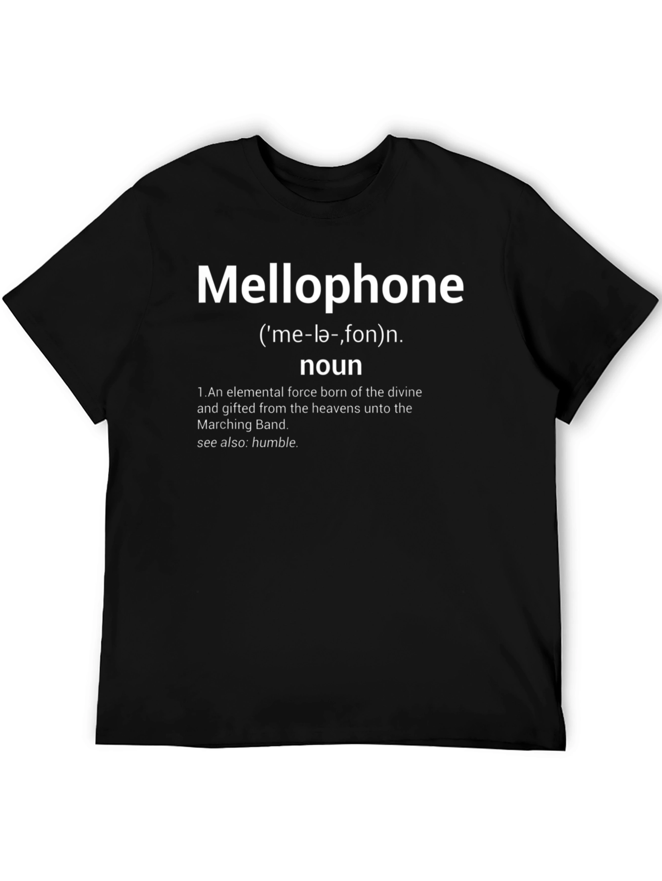 This black t-shirt features a humorous definition of the word 'Mellophone,' perfect for band members and music enthusiasts. The tee presents the word in bold, followed by its phonetic spelling and definition as 'an elemental force born of the divine and gifted from the heavens unto the Marching Band.' A playful 'see also: humble' adds a touch of humor. Made from a comfortable material, this shirt is great for casual wear, band practice, or showing off your musical side. It's a fun conversation starter and a unique addition to any musician's wardrobe.