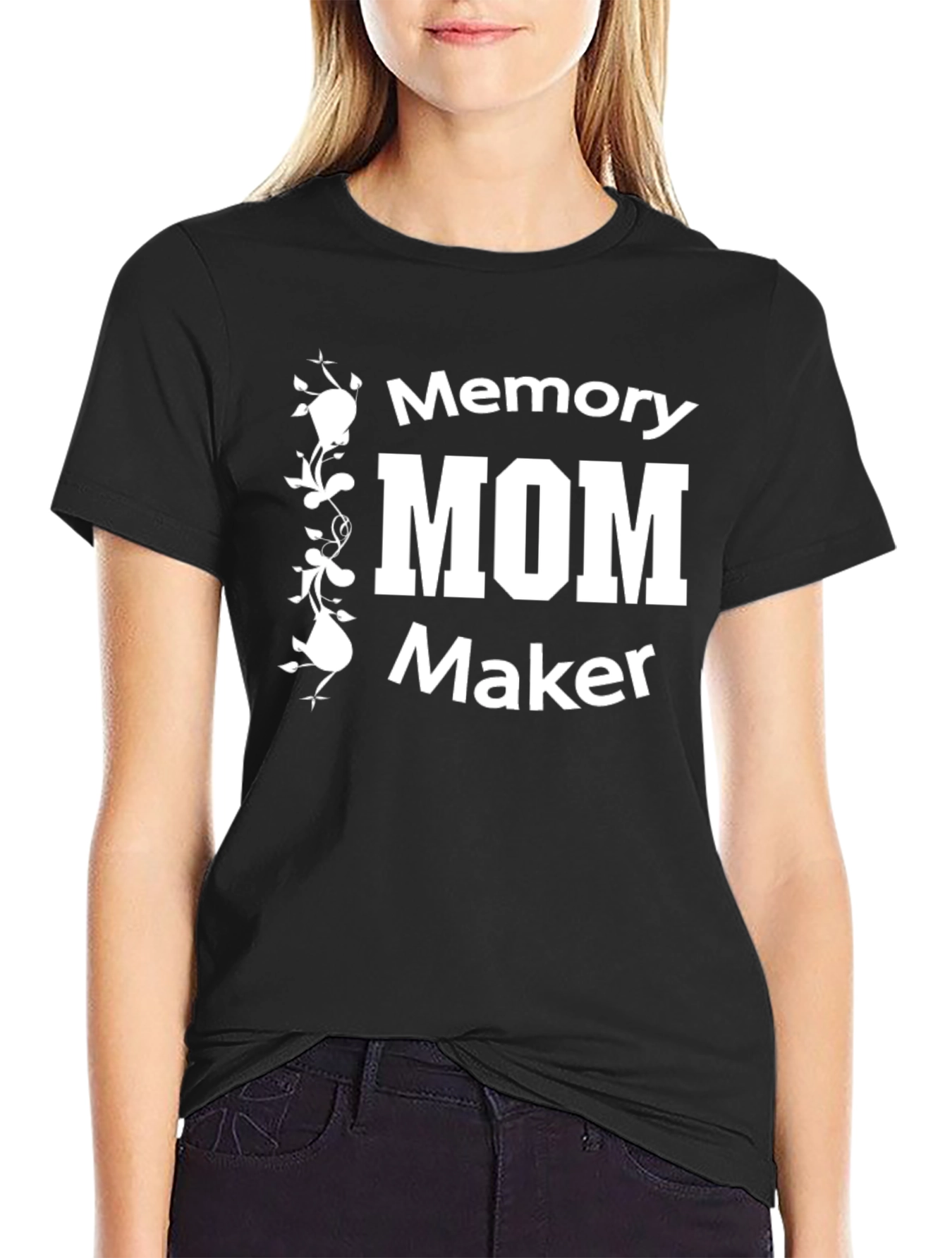 Celebrate motherhood with this stylish black t-shirt. Featuring the phrase "Memory MOM Maker" in bold, white font, accented with floral designs on the side. This classic crew neck tee offers a comfortable and flattering fit for everyday wear. Made from a soft, breathable fabric, this t-shirt is perfect for casual outings, family gatherings, or as a thoughtful gift for the amazing mom in your life. Show your appreciation with this unique and heartfelt design.