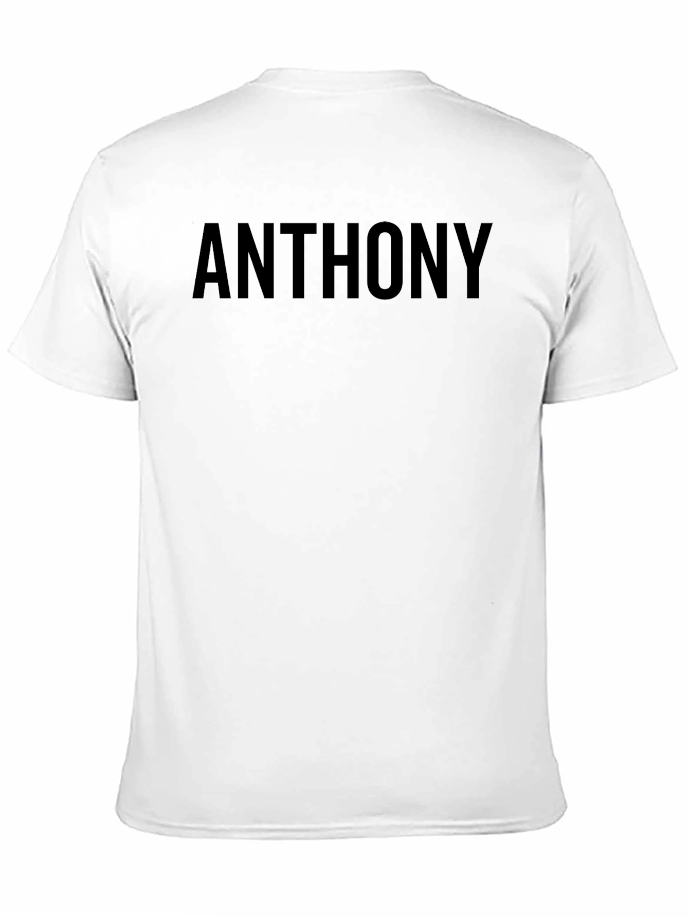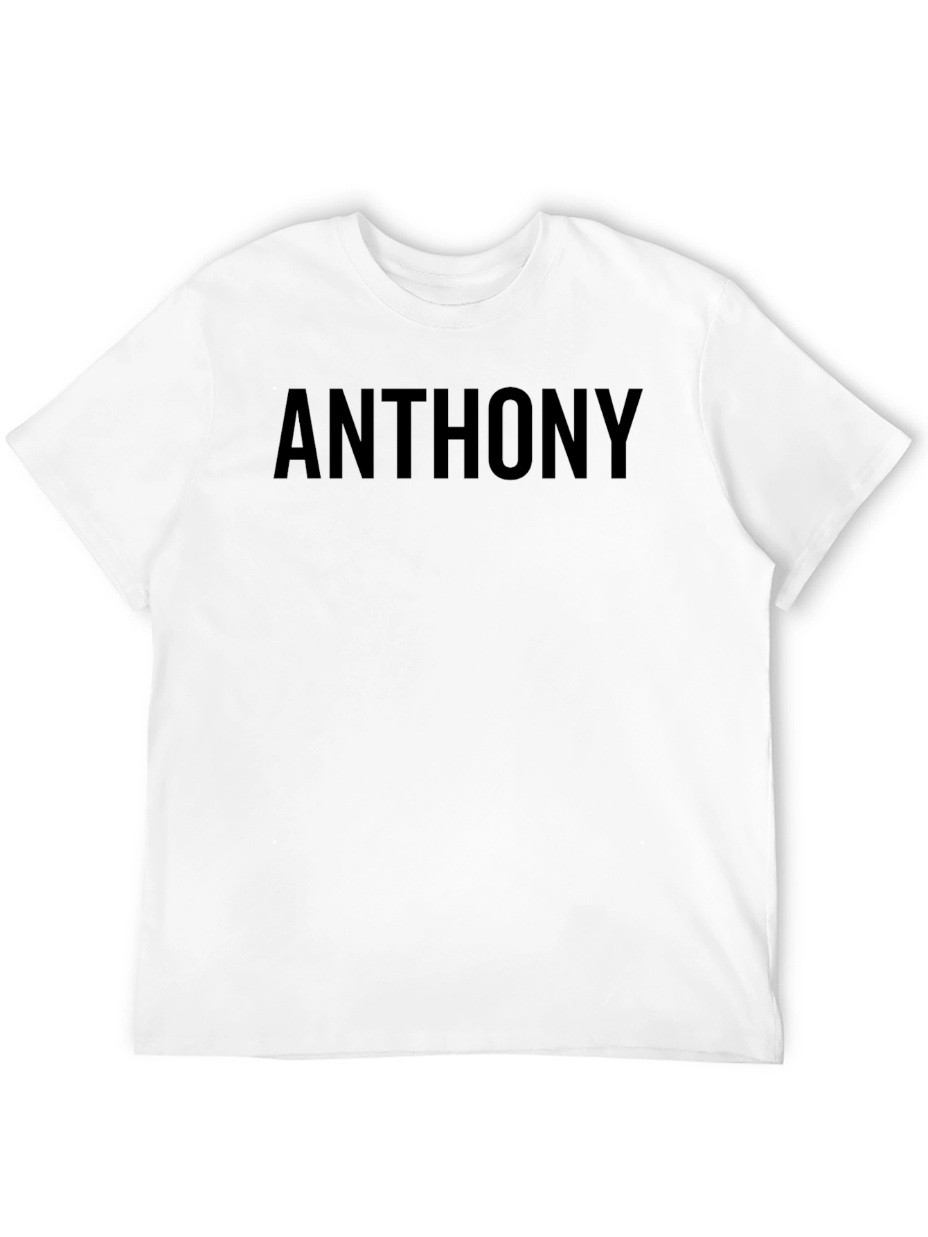 Showcase your unique style with this classic men's black t-shirt. Featuring the name 'Anthony' prominently displayed across the chest in bold, block lettering, this tee offers a personalized touch with a timeless appeal. The shirt is crafted from a soft-looking, comfortable fabric. The classic crewneck and short sleeves create a relaxed fit suitable for everyday wear. Pair it with jeans for a casual look or dress it up with chinos for a more refined style. This versatile t-shirt is perfect for showcasing your individuality and making a statement wherever you go.