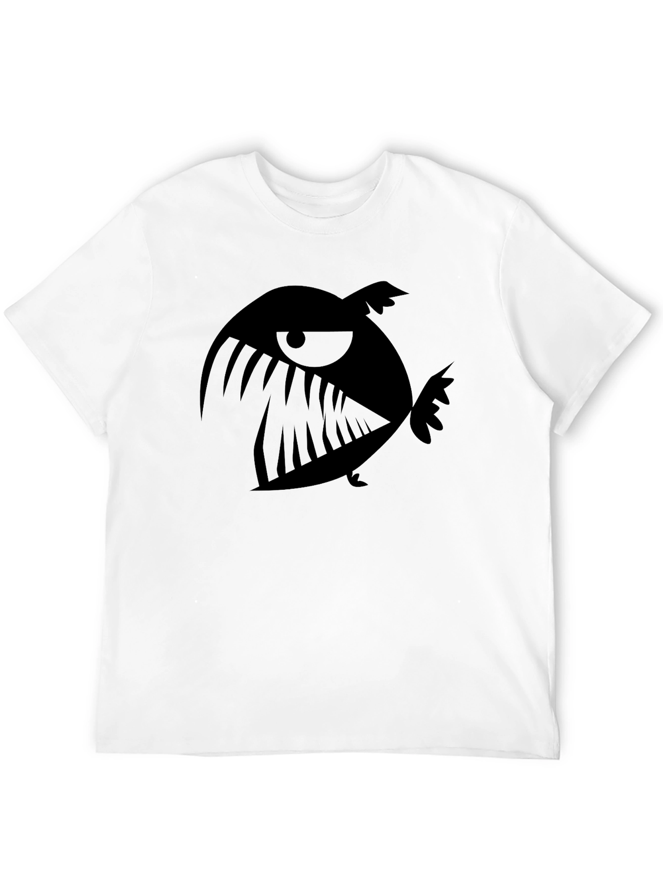 Show off your unique style with this bold men's black graphic t-shirt. The standout feature is a stylized cartoon fish design, rendered in solid black. The fish is depicted with a menacing expression and prominent teeth, creating a striking visual impact. This tee is constructed from a comfortable fabric, making it ideal for everyday wear. Pair it with jeans or shorts for a casual, edgy look. Perfect for those who want to make a statement without sacrificing comfort. Add this unique piece to your wardrobe today!