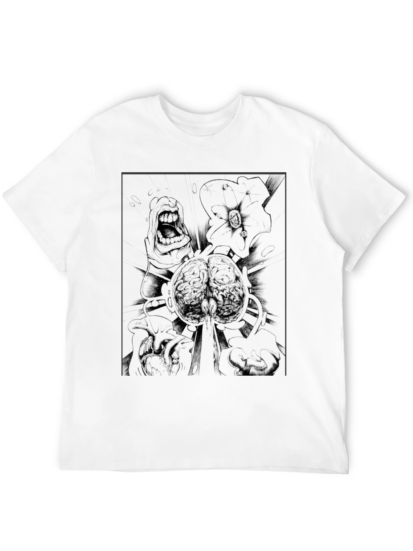 This men's black t-shirt features a bold, graphic design. The detailed artwork depicts a brain explosion, complete with intense imagery and dynamic lines. Crafted from comfortable, breathable fabric, this tee is perfect for casual wear. The classic crew neck and short sleeves offer a timeless fit, while the eye-catching print makes a statement. Ideal for those who appreciate unique and edgy designs, this t-shirt is sure to turn heads. Dress it up with jeans and a jacket, or keep it casual with shorts. Add a touch of unconventional style to your wardrobe with this striking graphic tee.