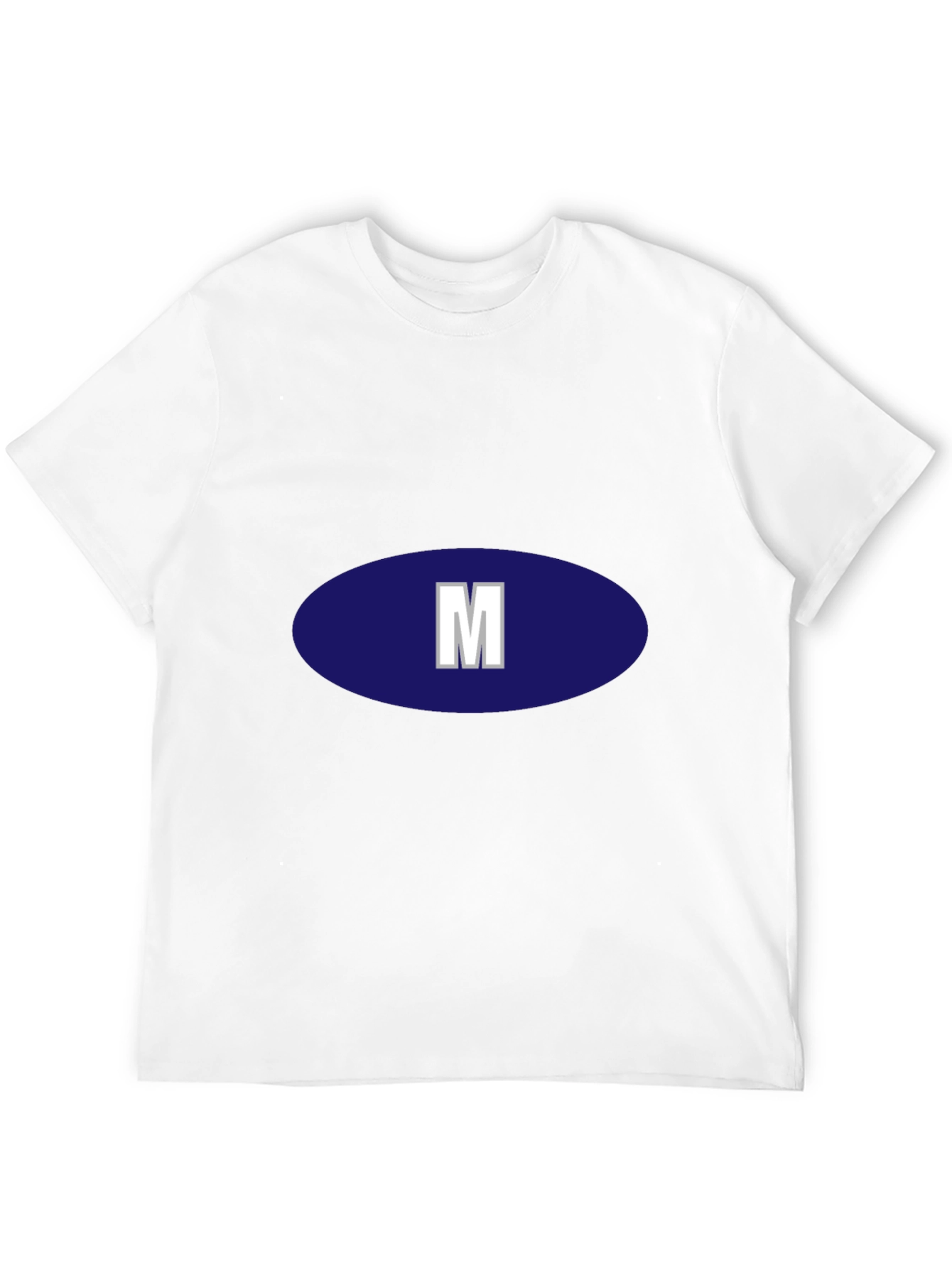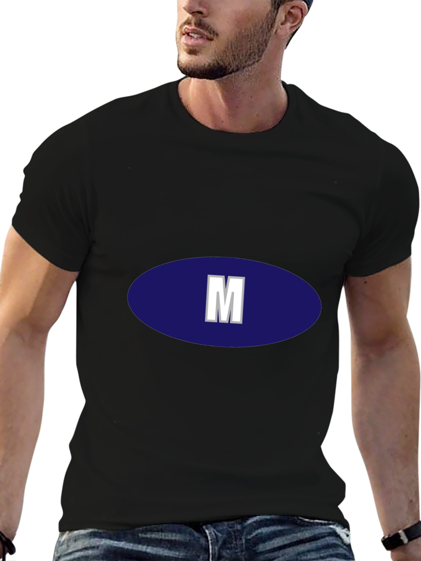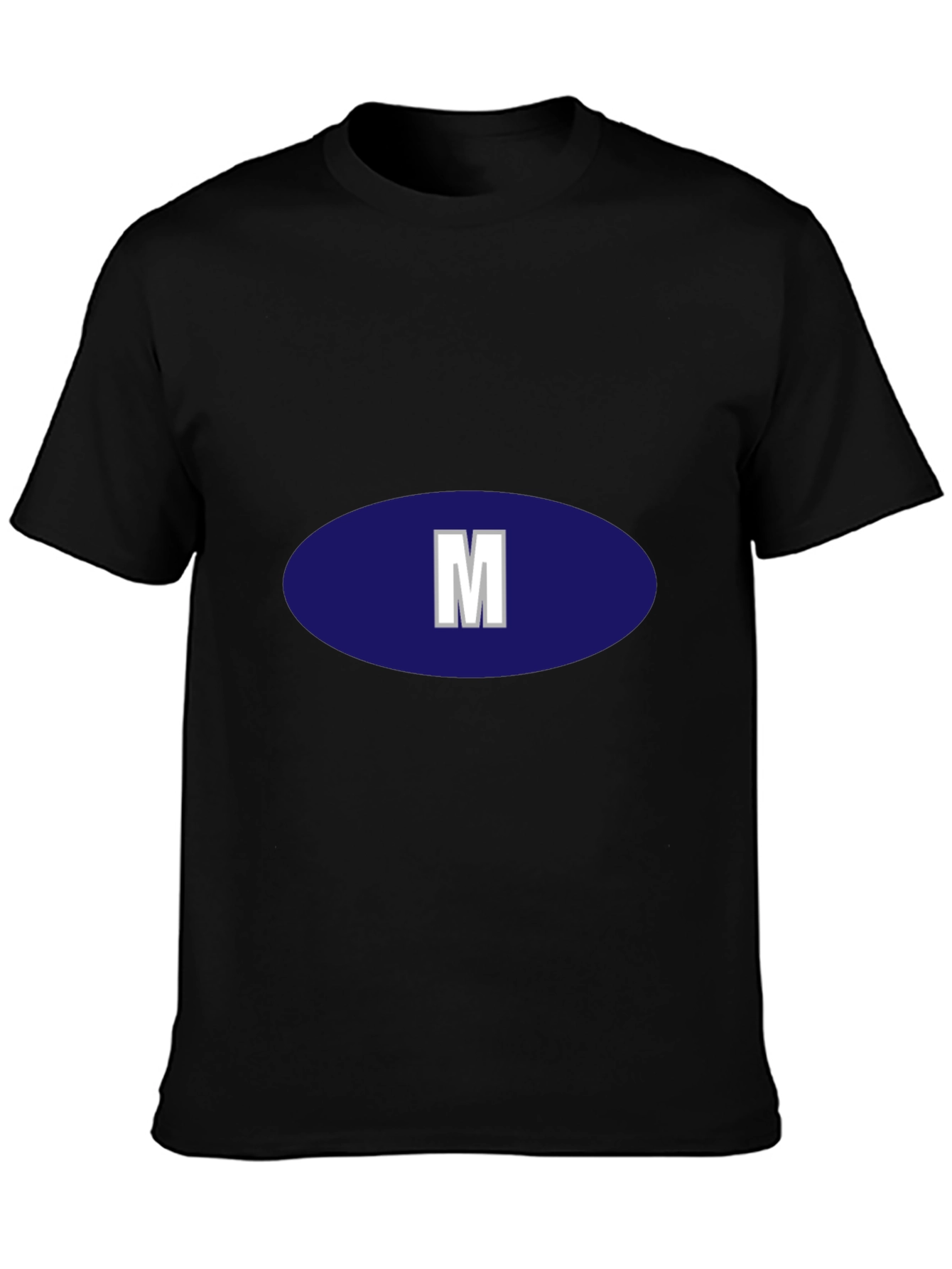 This classic men's black t-shirt features a bold and unique design. A navy blue oval patch adorns the chest, prominently displaying the initial "M" in a sleek, white font. The shirt's simple yet stylish design makes it versatile for casual wear, whether you're running errands or meeting up with friends. The soft, comfortable fabric ensures a great fit and all-day comfort. Stand out from the crowd with this eye-catching tee that adds a touch of personalized style to your wardrobe. A perfect gift for someone whose name starts with M.