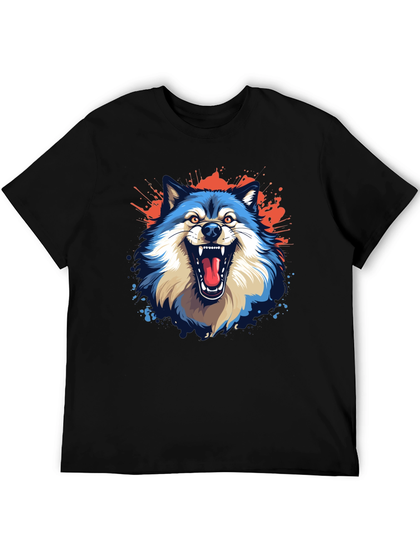 Show your wild side with this striking men's black tee! The bold graphic features a vibrant, snarling wolf with blue and white fur set against a dynamic red and blue splatter background. The design exudes power and confidence, making it perfect for casual wear or to add an edgy touch to any outfit. Made from a comfortable, breathable fabric, this t-shirt ensures all-day comfort and lasting style. It's a unique statement piece that will surely turn heads and spark conversations. Ideal for wolf lovers and those who appreciate bold, artistic designs, this tee is a must-have for your wardrobe.