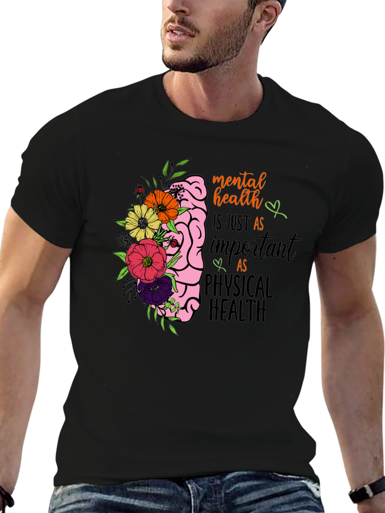 This eye-catching black t-shirt features a unique graphic design that promotes mental health awareness. The design incorporates a stylized brain with colorful floral accents. The message "mental health is just as important as physical health" is displayed in a charming script, reinforcing the importance of well-being. This tee is perfect for those who support mental health advocacy. The shirt's dark color makes the design pop, ensuring it is a statement piece. Soft, breathable, and comfortable, it can be worn casually or as a conversation starter at events. Show your support with this stylish and meaningful graphic tee.